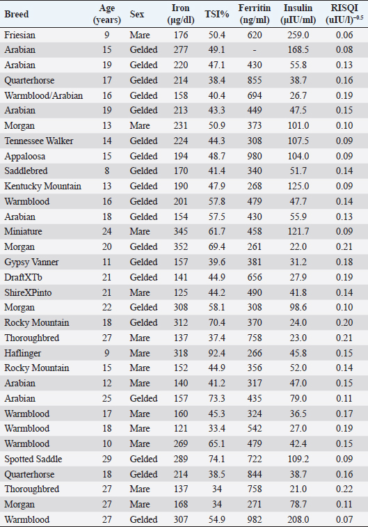 Open Vet. J.. 2019; 9(4): 287-293 doi: 10.4314/ovj.v9i4.2 Open Veterinary Journal, (2019), Vol. 9(4): 287–293 Short Communication DOI: http://dx.doi.org/10.4314/ovj.v9i4.2 Possible dysmetabolic hyperferritinemia in hyperinsulinemic horsesEleanor M. Kellon* and Kathleen M. GustafsonEquine Cushing’s and Insulin Resistance Group, Inc, 2307 Rural Road, Tempe, AZ 85282, USA *Corresponding Author: Eleanor M. Kellon. Equine Cushing’s and Insulin Resistance Group, Inc, 2307 Rural Road, Tempe, AZ 85282, USA. Email: drkellon [at] gmail.com Submitted: 03/04/2019 Accepted: 15/09/2019 Published: 21/10/2019 © 2019 Open Veterinary Journal AbstractBackground: Hyperinsulinemia associated with equine metabolic syndrome and pituitary pars intermedia dysfunction is a risk factor for laminitis. Research in other species has shown elevated body iron levels as both a predictor and consequence of insulin resistance. In humans, this is known as dysmetabolic hyperferritinemia. Aim: To explore the relationship between equine hyperinsulinemia and body iron levels. Methods: We reviewed case histories and laboratory results from an open access database maintained by the Equine Cushing’s and Insulin Resistance Group Inc. (ECIR). We identified 33 horses with confirmed hyperinsulinemia and laboratory results for serum iron, total iron binding capacity, and ferritin. Pearson correlation was used to test the relationship between insulin and iron indices. Additionally, we performed a secondary analysis of a previously reported controlled trial that was originally designed to test the correlation between iron status and the insulin response in horses. Here, we used a t-test to compare the mean values of insulin and ferritin between horses we categorized as normal or hyperinsulinemic based on their response to an oral challenge. Results: Serum ferritin exceeded published reference range in 100% of the horses identified from the ECIR database. There were no statistically significant associations between insulin indices (RISQI, log insulin) and iron indices (log serum iron, log TSI%, log ferritin). There were trends for a negative association between RISQI and log iron [r(31)=−0.33, p=0.058] and a positive association between age and ferritin [r(30)=0.34, p=0.054]. From the secondary data analysis of published data, we found significantly elevated ferritin (p=0.05) in horses considered hyperinsulinemic by dynamic insulin testing compared to horses with a normal response. Conclusion: These results suggest the potential for iron overload in hyperinsulinemic horses, a feature documented in other species and should stimulate further study into the relationship between insulin and iron dysregulation in the horse. Keywords: Equine, Ferritin, Hyperinsulinemia, Iron overload. IntroductionThe relationship between iron regulation, glucose homeostasis, insulin action, and secretion is complex. High body burdens of iron have been associated with decreased insulin sensitivity in humans (Huang et al., 2015; Ryan et al., 2018; Zafar et al., 2015) and increased risk of developing insulin resistance/hyperinsulinemia and type 2 diabetes mellitus (Simcox and McClain, 2013) while reduction of iron levels via phlebotomy may improve metabolic parameters (Fargion et al., 2005; Houschyar et al., 2012). Similarly, several species of captive birds and mammals are known to develop dietary iron overload and subsequent insulin resistance on zoo diets, including the close equine relatives; the tapir and black rhinoceros (Clauss and Paglia, 2012). Hyperinsulinemia is a component of equine metabolic syndrome (EMS) and may be a feature of pituitary pars intermedia dysfunction (PPID) (Frank and Tadros, 2014). Iatrogenic hyperinsulinemia while maintaining euglycemia induces laminitis in both ponies (Asplin et al., 2007) and horses (de Laat et al., 2010). Hyperinsulinemia is now believed to be by far the most common cause of naturally occurring laminitis (Morgan et al., 2015) and is a significant welfare issue with population studies showing 18% to 27% of horses/ponies being hyperinsulinemic (Durham et al., 2019). Smith et al. (1984) published a ferritin normal range which was correlated to the iron levels in the liver and spleen. That work, including the development of species-specific assays, remains the gold standard today. Smith established that, as in other species, ferritin is the best index of the liver and spleen nonheme iron stores in horses, with a high correlation between serum ferritin and hepatic and splenic tissue levels. Recognition of the link between iron and insulin resistance dates back to the early 1900s (Root, 1929). Since then, there has been considerable investigation of the role of iron in adipose tissue, effects of iron on glucose homeostasis, and the interplay between insulin and iron trafficking (Fernandez-Real et al., 2002) Suggested roles for insulin include stimulating enhanced uptake of extracellular iron and inducing relocation of transferrin receptors (Fernandez-Real et al., 2015). A genetic component is likely, suggested by significantly higher insulin and iron indices and a significant positive correlation between insulin and serum iron in the non-diabetic offspring of type 2 diabetics (Zafar et al., 2015). While the relationship between iron and insulin resistance has been the topic of intense research investigation in humans and other species, it has been largely unrecognized by equine medicine. There are more reports describing the relationship between iron, inflammation, and insulin sensitivity in rhinos than in horses because investigators recognized the relationship between metabolic disease and iron overload in black rhinos (Schook et al., 2015). To the authors’ knowledge, there is only a single controlled pilot study describing the relationship between iron status and the insulin response in horses (Nielsen et al., 2012). Nielsen et al. measured the insulin response to a glycemic challenge (dextrose or corn