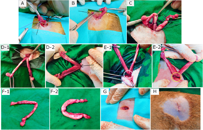 Fig. 2. Phases of ligation and transection during the process of ovariohysterectomy along with wound closure. (A) Ligated ovarian vascular pedicle (black arrow). (B) Ovary bearing uterine horn (white arrow) separated from pedicle (black arrow). (C) Externalized contralateral uterine horn with ovary having attachments. (D-1) Exposure of uterine body (white arrow) with extended horns in a cat of Group A. (D-2) Uterine body (black arrow) with horns in a cat of Group B. (E-1) Single transfixing ligature in uterine body (white circle). (E-2) Multiple transfixing ligatures in uterine body (yellow circle). (F-1) Transected uterine horns and ovaries accompanying a little portion of uterine body from a cat of Group A. (F-2) Discarded uterine horns and ovaries with a smaller part of uterine body from a cat of Group B. (G) Closure of muscles. (H) Closure of skin.