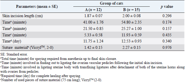 AbstractBackground: Spaying is considered a reliable surgical method for birth control and preventing potential feline reproductive diseases. Aim: This experiment was carried out to evaluate the suitability of the left lateral flank approach for routine spaying in cats. Methods: Twenty-seven queens of 7–24 months old and 1.5–3.5 kg body weight (BW) were spayed through flank laparotomy on the left lateral side of the abdomen. The cats were categorized into two groups: Group A (n=12; cats did not yet give birth) and Group B (n=15; cats gave birth before). The studied variables included age, BW, vaccination history, skin incision length, total surgical duration, the time needed for ligating ovarian pedicles and uterine body, suture materials, postoperative complications, and healing duration. Results: There were no significant differences (p < 0.05) in age, BW, and vaccination history of the cats between the two groups. The mean incision length and total duration of surgery were greater in the case of Group B than in Group A. The ease of entering into the peritoneal cavity, duration of ligating the ovarian pedicles, and transfixing the uterine body did not vary significantly (p < 0.05) between the groups although a longer time was taken for Group B than Group A. 62.96% spayed cats were found with no postoperative complication. The observed complications included wound site infection (7.41%), dehiscence of suture lines (11.11%), bleeding (3.70%), and oozing (14.82%) from wounds which were further treated successfully for complete recovery. Conclusion: Left lateral flank approach can be an effective method of spaying in queens without any life-threatening complications. Keywords: Ovariohysterectomy, Flank celiotomy, Ligation, Postoperative complication, Queens. IntroductionUnwanted domestic and stray cats are a global problem as it gives rise to various issues of cat welfare (Kiani et al., 2014; Roberts et al., 2015). Spaying is the most common surgery performed in female cats as a means of population control (Levy and Wilford, 2013; Murugesan et al., 2020) which involves removing both the ovaries and uterus called ovariohysterectomy, and sometimes only the ovaries are surgically removed (ovariectomy) for sterilization (Omeran et al., 2014). Apart from only birth control, spaying stamps out the incidences of pyometra, metritis, dystocia, uterine torsion, localized or diffuse cystic endometrial hyperplasia, uterine rupture, uterine neoplasia, mammary tumors, and many other reproductive disorders (Stone, 2003; Murugesan et al., 2020). It also decreases the rate of pseudopregnancy and increases the longevity of animals (Michell, 1999; Kiani et al., 2014). Cats usually exhibit their first heat (estrus) around 6 months of age (White, 2012). In cats, the behavioral signs of estrus (i.e., frequent and irritating vocalization, head rubbing to owners, rolling on the floor, tail deviation, treading, nymphomania, and lordosis), very short inter-estrus interval, and chances of conceiving frequently initiate the pet owners to go for ovariohysterectomy (Heffelfinger, 2006; Nelson and Couto, 2014; Oliveria et al., 2014). Elimination of estrus is often required to check vaginal bleeding, behavioral changes, the attraction of males, and undesired mating (Valle and Junior, 1999). Estrus-influenced female sexual behaviors in cats can be completely suppressed by ovariohysterectomy or ovariectomy with or without changes in the nonsexual behaviors (Hart and Eckstein, 1997; Sontas and Ekici, 2007). Usually, feline ovariohysterectomy is performed either through a ventral midline approach or a lateral flank approach (Babu et al., 2018; Murugesan et al., 2020). The flank approach being a substitute for the traditional ventral midline approach for spaying is found to be preferred in the UK, and the midline approach is popular in the USA (Coe et al., 2006; Kiani et al., 2014). The ventral midline approach is recommended when the female cats are pregnant or in various uterine pathological conditions although there may be more hemorrhage and chances of wound infection due to the ventral position, and the wound complications are often difficult to get notified (Babu et al., 2018). Hence, a lateral flank approach is preferred by many veterinarians for ovariohysterectomy in cats. The cost and duration involved in the procedures of ovariohysterectomy largely depend on incision length, closure of the muscles and skin, and for that reason, it is needed to follow such a surgical technique that can be practiced in the least invasive way, e.g., involvement of minimum incision, trauma, and suture materials with short duration. Therefore, this research was conducted to justify the left lateral flank approach as a minimally invasive surgery for regular spaying in cats focusing on better healing with minimum complications. Materials and MethodsThis research work was carried out from May 2021 to March 2022 in the Veterinary Teaching Hospital of Bangladesh Agricultural University to execute spaying in female cats through celiotomy in the left lateral flank. Experimental animalsThis research work included 27 female cats of 1.5–3.5 kg body weight (BW) and aged 7–24 months, which were brought to the Veterinary Teaching Hospital to spay for birth control. Before the surgery, the cats were thoroughly checked whether they had any estrus, pregnancy, or other systemic diseases, and found to be healthy having no such kind of incidences. In addition, the queens were recommended to be fasted for 16 hours before spaying to prevent anesthesia-related complications. Experimental groupsFor this experiment, the queens were categorized into two groups: Group A and Group B. Group A consisted of 12 female cats that did not give birth to kittens yet, whereas 15 cats that gave birth before were included in Group B. Studied particulars of the catsIn both groups, the recorded data from the cats were based on age, BW, and vaccination history for cat fl
