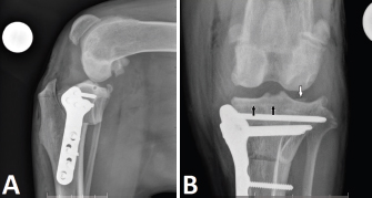 Fig. 1. Mediolateral (A) and craniocaudal (B) radiographs illustrate medial tibial intra-articular jig pin hole placement. The white arrow indicates an osteochondral fragment created during intra-articular pin placement. Statistical analysisA chi-squared test was performed to test if there was an association between intra-articular jig pin placement and level of experience of the surgeon, according to residency year and board-certified surgeon status. The Cochran Armitage trend test was also performed to test if an increase in experience decreased the odds of intra-articular jig pin placement. A chi-squared test was performed to test for any association between TPA (lower versus higher than 30°) and intra-articular jig pin placement. p value <0.05 was considered significant. ResultsA total of 1150 records were evaluated; 696 stifles met the inclusion criteria. The distribution of radiographs by side was uniform; 365 (52.5%) dogs had TPLO of the left hind limb, and 331 (47.5%) dogs had TPLO of the right hind limb. The mean ± standard deviation preoperative TPA was 27.5° ± 3.5°. The TPA was ≤30° in 552 (79.3%) dogs, and >30° in 144 (20.7%). Intra-articular placement of the temporary jig pins was identified in 37 (5.32%) stifles according to the position of the radiolucent pin tract observed on the postoperative radiographs. Seven (19%) were classified as medial tibial plateau jig pin placement, and 30 dogs (81%) were considered as lateral tibial plateau jig placement. The TPA was ≤30° in 30 (81%) dogs, and >30° in 7 (19%) dogs with intra-articular jig placement. There was no association between the TPA and intra-articular placement of the jig pin (p=0.79). The predominant breed of dogs with intra-articular jig pin placement was Labrador Retriever (n=12), followed by mixed breed dogs (n=10), German Shepherd (n=4), Rottweiler (n=3), and Weimaraner (n=2). The median age was 6 years (range: 3–12 years). There were 15 castrated males and 22 spayed females. The median body weight was 31.5 kg (range: 6.8–69.7 kg).