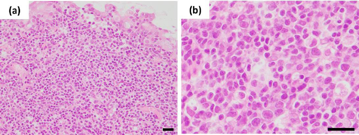 Fig. 3. Histopathological findings of the nasopharyngeal mucosa. (a) The submucosa of the nasopharyngeal tissue had expanded by a neoplasm composed of solid sheets of round cells. (b) Nuclei were round to oval, measured two erythrocytes in diameter, and had one to three nucleoli. Hematoxylin and eosin stain (Bar=20 μm).