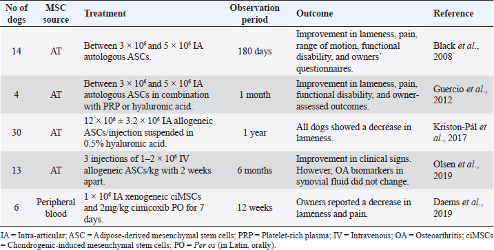 Regarding MSCs source, the most commonly used in veterinary medicine are AT and BM. None of these studies has demonstrated the superiority of one cell source over another. However, stem cells derived from AT were the most used by the authors, probably due to their easier extraction, namely in elective ovariohysterectomy. MSCs therapy can be autologous/allogeneic or xenogeneic depending on whether stem cells are obtained, respectively, from the same animal, same species donor or from different species. Two studies regarding canine OA treatment have used xenogeneic MSCs from porcine or horses, reporting excellent results with no severe adverse effects in none of the dogs (Tsai et al., 2014; Daems et al., 2019). Regarding the routes of administration, the one that is preferentially selected is the injection of MSCs directly at the injury site. Experimental studies support the greater effectiveness of the intralesional route of administration when comparing to others. Intra-articular injection of ASCs is the most commonly reported route to deliver cells into the damaged cartilage; however, in most cases, it requires anesthesia or sedation, and synovial fluid from arthritic joints is reported to be cytotoxic to cultured MSCs (Kiefer et al., 2015). Therefore, new protocols with the intravenous route have been developed. The intravenous administration of MSCs promotes a better interaction with the immune system, which may lead to systemic anti-inflammatory effects and reduce pain at multiple sites. However, despite the attraction of MSCs to the injured areas by the intravenous route, its effectiveness was reported to be low in some studies (Eggenhofer et al., 2014; De Becker and Van Riet, 2016). Shah et al. (2018) compared ASC therapy by different administration routes in dogs with OA. They realized that the intra-articular way had better improvements than the intravenous one. Olsen et al. (2019) studied the effect of ASCs by intravenous route in dogs with OA. Despite the improvement in clinical outcome, subjective outcome measures (such as OA biomarkers in synovial fluid) did not confirm similar progress. These results reveal the need for larger samples sizes and CGs to interpret the outcomes and more research before intravenous MSCs becomes a therapeutic option for dogs with OA. It is necessary to increase our knowledge of the MSC migration process to improve it. According to previous studies, it has been reported that treatment with ASC or BMSC in combination with PRP or PRGF improves clinical signs, reducing lameness and providing notable recovery of previous limited sports activities (Cuervo et al., 2014). The effect of PRP is due to the behavior of the platelet concentrate, acting as a scaffold which, through the release of growth factors (such as TGF-β, fibroblast growth factor and IGF-1), promotes the stimulation of chondrogenesis, increases hyaluronic acid production, promotes angiogenesis, and differentiation of the existing cells in the treated area (Cuervo et al., 2014; Upchurch et al., 2016). The PRGF is considered a better choice by some authors due to the optimal concentration of platelets and absence of white blood cells (Nishiyama et al., 2016). Cuervo et al. (2014) demonstrated that a single IA injection of ASCs is significantly more effective than one IA injection of PRGF. Therapy with PRGF alone showed similar improvements as ASC in the first month post-treatment. However, better results were observed in the long term in patients with ASCs. Other studies had great results in the combination therapy: MSCs with PRP or PRGF (Cuervo et al., 2014; Canapp et al., 2016c; Mcdougall et al., 2018). MSCs therapy with specific concomitant medication proved detrimental to treatment, particularly with NSAIDs, generally used for these conditions. Shah et al. (2018) studied allogeneic ASC therapy in dogs with OA, reporting only one case that did not respond to the treatment and had shown worsening of the condition. This dog was the only one receiving NSAIDs therapy at the same time as MSCs therapy. Most studies did not include immunohistochemistry, immunofluorescence, and histopathology to confirm that MSCs have differentiated and/or incorporated into the injured tissues. Further studies will be needed to definitely prove stem cell differentiation and engraftment. However, their initial cell-to-cell contact and cytokine release effect seems to be the most significant therapeutic impact of these cells. ConclusionMSCs have been shown to have an excellent potential for orthopedic therapy in dogs, especially for OA, where all studies presented promising results. This therapy has shown no evident adverse effects, even with its allogeneic administration, making them a safe and promising therapeutic option. The main obstacles to this therapy are the inconsistency of protocols applied to date, the small samples used for clinical trials, patient variability, and the follow-up time of cases after therapy. Besides, it should be noted that cell therapies in veterinary patients are not strictly supervised by regulatory agencies in most countries. There is an urgent need for health agencies, national and across borders, such as European Medicines Agency (EMA), to define and regulate the standardization and criteria for the safe and efficient application of these therapeutic approaches. Future trials should have more homogeneous and larger samples, predefined standardized stem cell protocols for treatment groups, presence of CGs, and continue data collection for more extended periods (more than 6 months) for appropriate long-term conclusions. Currently, therapy based on MSCs requires, more than ever before, a thorough analysis and consideration in the hope of overcoming its limitation in upcoming trials. AcknowledgmentsThis research was funded by National Funds by FCT (Portuguese Foundation for Science and Technology) under the project UIDB/AGR/04033/2020. Conflict of interestP.P.C. declares to be the fo