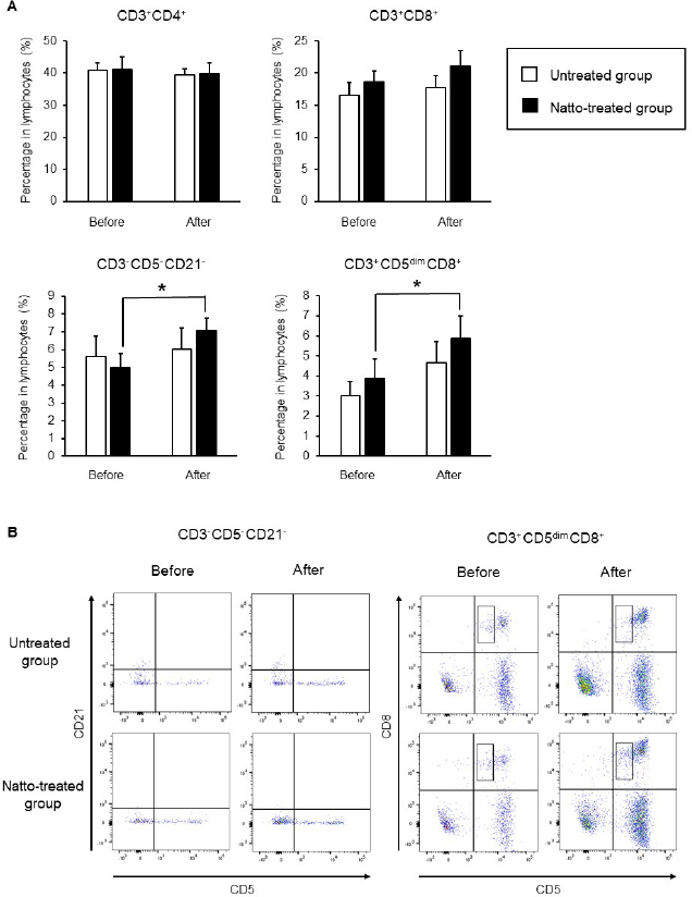 Fig. 1. Cell surface antigen analysis using flow cytometry. (A) Proportions of helper T cells (CD3+ CD4+ cells), cytotoxic T cells (CD3+ CD8+ cells), and NK cells (CD3− CD5− CD21− cells and CD3+ CD5dim CD8+ cells). (B) Representative plots of the detected NK cells. Before: before administration, after: after administration. Data represent mean ± SE. *p < 0.05 versus before administration.