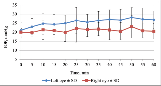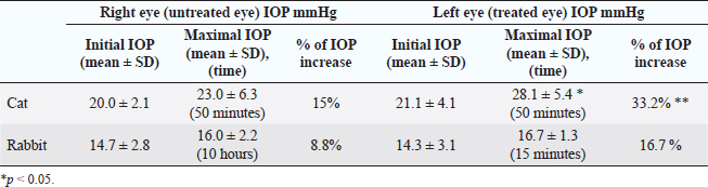 Statistical methodStatistical analysis of the data was performed using statistical software programs SPSS and Microsoft Excel. Normality was tested using Shapiro–Wilk test. To determine the effect of topical 1% cyclopentolate, the arithmetic mean values (X) and standard deviation (SD) of the IOP, HPD, and the STT was calculated for each eye separately. Changes in the IOP, HPD, and STT between eyes and over time were evaluated using a paired two-sample repeated measures T-test. p values less than 0.05 were considered to be statistically significant. Ethical approvalThis study was approved by the Committee for Animal Protection and Ethical use. In all cases, informed consent was obtained from the pet owners for the study. ResultsDuring the study, no signs of ocular irritation or pain were detected in any of the animals examined at any time point. Effects of 1% cyclopentolate on IOP in cats and rabbitsInitial pre-treatment IOP in cats and rabbits are shown in Table 2. Mean IOP values before topical cyclopentolate application between right and left eye were not significantly different (p=0.879). The effects of 1% cyclopentolate during the first treatment hour are shown in Figure 1. In the cats, IOP in cats increased at T5, the first post-treatment measurement in the treated eye. A statistically significant increase was reached at T20 (24.9 ± 4.5 mmHg) and at T50 time point IOP had increased from the pre-treatment value for a mean of 7 ± 4.0 mmHg to a maximum 28.1 ± 5.4 mmHg (p=0.004) (Table 2). From this time, forward IOP slowly decreased but still was significantly higher than pre-treatment values until 2 hours after treatment, showing values from 19.9 to 28.1 mmHg. Only 4 hours after treatment, IOP returned to T0 values (p > 0.05). The increase in IOP in the treated eye compared to the untreated eye was statistically significant at the T40, T45, T55, T60, T2h measurement periods (p < 0.02). The IOP in the contralateral eye did not significantly increase throughout the treatment period: the IOP values were from18.5 ± 3.3 mmHg to 23.0 ± 6.3 mmHg. Table 2. Effect of 1% cyclopentolate on IOP (mean values ± SD) in the feline and rabbit’s right and left eye.