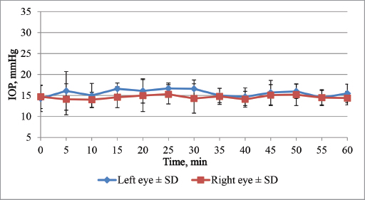 Fig. 2. Effect of unilateral cyclopentolate on the IOP in rabbit first hour after treatment.