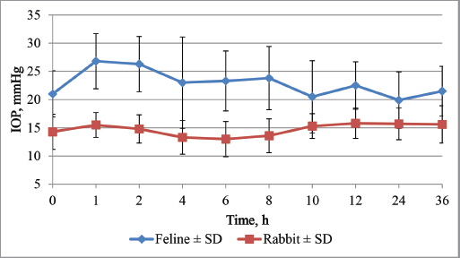 Fig. 3. Effect of unilateral cyclopentolate on the IOP in feline and rabbit in 36 hours. In rabbits, HPD at T10 had increased significantly compared to pre-treatment and control eyes and continued to increase, reaching a maximum of 11.1 ± 1.35 mm at T25 (Table 3). The increase in pupil diameter from the T0 value until the maximum values was 3.1 ± 1.5 mm (p=0.004). In rabbits HPD returned to pre-treatment values at T10h–T12h after treatment (8.9 ± 1.9 and 8.1 ± 2.1 mm) (Fig. 5). Differences in the HPD between the treated and untreated eye were statistically significant from T10 to T8h (p < 0.037). In cats, HPD returned to near pre-treatment values only 24–36 hours after treatment (12.1 ± 2.6 and 11.2 ± 3.5 mm, respectively) (Fig. 6). Differences in the HPD between the treated and untreated eyes were statistically significant from T20 to T24h (p < 0.034). The results concerning the pre-treatment and maximum HPD values of HPD in cats and rabbits are shown in Figure 6. Effects of 1% cyclopentolate on STT in cats and rabbitsThe STT results of pre- and post-treatment effects of cyclopentolate in cats and rabbits are shown in Table 4. Before treatment, there were no significant differences in the STT between the right and left eyes of cats and rabbits (p > 0.05). In cats, STT decreased in both eyes significantly at 30 minutes after treatment and remained low throughout the 36 hours period (Fig. 7), showing a maximum decrease in untreated eye to 10.2 ± 5.5 mm/minute at 60 minutes and to 11.0 ± 7.4 mm/minute in the treated eye 2 hours after treatment (Table 4) and reminded at this level throughout till 36 hours after treatment (Fig. 7).