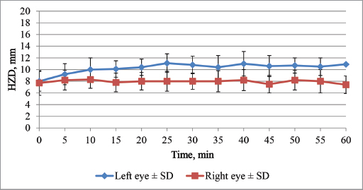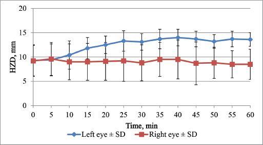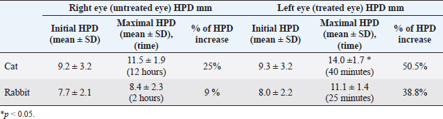 Fig. 4. Effect of unilateral cyclopentolate on the HPD in feline first hour after treatment. Table 3. Effect of 1% cyclopentolate on HPD (mean values ± SD) in the feline and rabbit’s right and left eye.