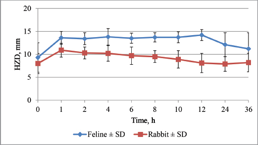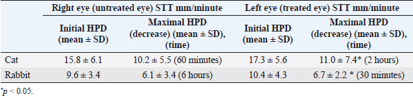 Fig. 6. Effect of unilateral cyclopentolate on the HPD in feline and rabbit in 36 hours. Table 4. Effect of 1% cyclopentolate on STT (mean values ± SD) in the feline and rabbit’s right and left eye.