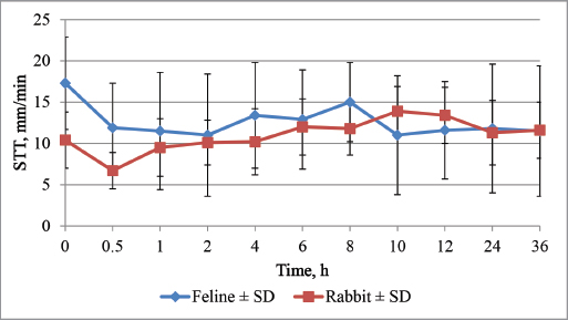 Fig. 7. Effect of unilateral cyclopentolate on the STT in feline and rabbit in 36 hours. In this research, the IOP, HPD, and STT were measured before the topical administration of the cyclopentolate eye drop in all cats and rabbits. The IOP in cats was 20.0 ± 2.1 mmHg in the right eye and 21.1 ± 4.1 mmHg in the left eye, which is similar to previously reported values—20.74 mmHg (Rusanen et al., 2010) and range of IOP in Stadtbäumer research (16–21 mmHg) (Stadtbäumer et al., 2006). In mixed breed rabbits, the normal IOP average was 14.7 ± 2.8 mmHg in the right eye and 14.3 ± 3.1 mmHg in the left eye. Previously reported values in adult New Zealand White rabbits were lower, 9.51 ± 2.62 mmHg (Pereira et al., 2011). In this study, the average STT before drug administration in all cats included in this study was 15.8 ± 6.1 mm/minute in the right eye and 17.3 ± 5.6 mm/minute in the left eye, which is similar to previously reported values—20.80 ± 2.25 mm/minute (in a range of 14–25 mm/minute) (Aftab et al., 2018). In this study of mixed-breed rabbits, the normal average was STT 9.6 ± 4.3 mm/minute in the right eye and 10.4 ± 3.4 mm/minute in the left eye. Previously reported values in adult English Angora were lower, 5.4 ± 1.6 mmHg and 4.6 ± 1.2 mmHg in Dutch rabbits, respectively (Rajaei et al., 2016). Mydriatic drugs can cause mechanical obstruction of the iridocorneal angle due to pupillary dilatation or increase the resistance to aqueous outflow through the relaxation of the ciliary muscle (Harris, 1968; Valle, 1974; Velasco et al., 1998); therefore an increase of IOP during use of mydriatics is expected. In this research, a statistically significant increase in IOP was observed at T20 and continued to increase to a maximum at T50 which was greater than the published normal values in cats (Gelatt et al., 2013). This IOP increase occurred until 2 hours after treatment but at 4 hours after treatment IOP returned to T0 values. Stadtbäumer et al. (2006) has shown that 1% cyclopentolate the same as 1% atropine and 0.5% tropicamide caused a significant IOP increase in cats 2 hours after cyclopentolate, 1.5 hours after tropicamide, and even 16 hours post atropine treatment (Stadtbäumer et al., 2006). Stadtbäumer et al. (2006) showed a significant increase of IOP at 1, 1.5, and 2 hours after cyclopentolate treatment; however, no measurements were made during the first hour post-treatment. This study discovered maximum IOP occurred was reached during the first hour after treatment. In rabbits, at the same time we noticed a slight increase of IOP, which showed a significant increase, but clinically not important increase only 25 and 30 minutes after treatment. In author’s knowledge, there are no similar data on rabbits, but in the research with Beagles no significant effect on IOP was found at any time point after treatment, showing significant species differences (Costa et al., 2016). As we know, the onset and duration of mydriatics differ among species, the drug used and its concentration, also in human’s pigmentation level of irides (Rubin and Wolfes, 1962; Hug and Olitsky, 2007). About one percentage cyclopentolate in cats reached maximum HPD at T40 showing more faster increase of HPD than in Stadtbäumer’s work where the maximum of HPD was reached 2 hours after treatment. In our research, maximal IOP values followed 10 minutes after maximal HPD and pupil dilation lasted much longer than IOP increase, arguing against mechanical obstruction of iridocorneal angle as an only mechanism. Also, parasimpatolitics by causing relaxation of the ciliary muscle can reduce ciliary muscle tone and decrease aqueous outflow (Harris, 1968; Velasco et al., 1998). HPD almost reached pre-treatment values 24–36 hours after treatment compared to previous research only after 56 hours (Stadtbäumer et al., 2006), showing long-lasting cyclopentolate effect on HPD in cats. In Beagles, where mydriasis was observed in 30 minutes after treatment and maximum reached 12 hours after treatment, lasted longer than in our research—72 hours (Costa et al., 2016). In goats, maximal mydriasis was observed 1 hour after treatment; duration was even 12 hours, showing good but late-onset mydriasis (Whelan et al., 2011). In rabbits, we found HPD maximal values much earlier, 25 minutes after treatment, at the same time, when maximal IOP increase. Pre-treatment values were obtained 10–12 hours after treatment, which in our mind gives faster mydriasis and shorter duration than in cats, dogs, and goats. In the author’s knowledge, these are the novel data on 1% cyclopentolate effects on IOP and HPD in rabbits. These results show that cyclopentolate do not influence IOP in rabbits as much as cats, similarly like in dogs, where 1% cyclopentolate had no effect of IOP in Beagles (Costa et al., 2016), but we need to mention that mydriasis was not enough complete and in author’s knowledge to provide a full fundus examination. Cyclopentolate has similar pharmacokinetics and pharmacodynamics as atropine, and our results possibly show that it has less effect on IOP as atropine in rabbits, but comparing research should be done. There is one report on the effects of cyclopentolate and atropine in rabbits but after multiple everyday treatment; therefore, it is difficult to compare because of different protocols and measurement methods (Sadeghi-Hashjin and Manokzadeh, 2008). Comparing to cyclopentolate effect in humans, it is showed that maximal mydriasis was observed 10 minutes after treatment (Manny et al., 1993) and 45 minutes (Farhood, 2012). Mood et al. (2019) showed that in horses maximal HPD was obtained only 12 hours after application. Based on data published previously that there is luck of effect on IOP and HPH in the contralateral non-treated eye, the left eye was used as a control (Stadtbäumer et al., 2006; Gomes et al., 2011). Also, in our research, no statistically significant changes were seen in the 