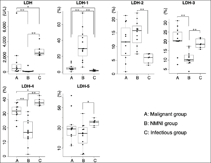 Fig. 2. Comparison of LDH isoenzyme activities in PE and AF among the malignant, NMNI, and infectious groups. Box plots show the median, range, and 25th and 75th quartiles within the groups. LDH level, LDH-3, and LDH-4 activities were significantly higher in the malignant group than those in the NMNI group (p=0.007, 0.007, and 0.002, respectively). LDH-1 activity was significantly lower in the malignant group than that in the NMNI group (p < 0.001). LDH-1 activity was significantly lower in the malignant group than that in the infectious group (p=0.031). LDH level and LDH-4 activity were lower in the malignant group than those in the infectious group (p=0.015, respectively). Statistical analyses were performed using the Kruskal–Wallis test. Post hoc comparisons were conducted using the Mann–Whitney U test with Bonferroni correction. *p < 0.05, **p < 0.01; LDH, lactate dehydrogenase; PE, pleural effusion; AF, ascitic fluid; NMNI, non-malignant, non-infectious. Comparison of LDH-1 activitiesThere were no significant differences in the serum LDH-1 activity among the malignant (12.3%; 10.4%–17.0%), NMNI (25.2%; 13.2%–33.2%), and infectious groups (13.3%; 12.8%–19.7%) (p ≥ 0.05). In PE and AF, the LDH-1 activity in the malignant group (4.4%; 3.5%–6.0%) was significantly higher than that in the infectious group (2.0%; 1.3%–2.7%) (p < 0.05). The LDH-1 activity in the NMNI group (29.6%; 23.4%–44.5%) was significantly higher than that in the malignant (p < 0.01) and infectious groups (p < 0.01). Comparison of LDH-2 activitiesThere were no significant differences in the serum LDH-2 activity among the malignant (8.5%; 5.4%–16.5%), NMNI (8.8%; 6.6%–10.7%), and infectious groups (9.8%; 7.4%–12.5%) (p ≥ 0.05). In PE and AF, the LDH-2 activity in the NMNI group (15.9%; 12.0%–17.1%) was significantly higher than that in the infectious group (6.0%; 4.5%–7.0%) (p < 0.01). There was no significant difference in the LDH-2 activity between the malignant (11.7%; 6.8%–16.8%) and NMNI (p ≥ 0.05) or infectious groups (p ≥ 0.05). Comparison of LDH-3 activitiesThere were no significant differences in the serum LDH-3 activity among the malignant (16.6%; 8.7%–22.6%), NMNI (10.5%; 9.0%–12.1%), and infectious groups (16.0%; 14.3%–18.4%) (p ≥ 0.05). In PE and AF, the LDH-3 activity in the NMNI group (10.1%; 9.5%–12.5%) was significantly lower than that in the malignant (20.4%; 20.1%–25.0%) (p < 0.01) and infectious groups (18.5%; 17.2%–20.7%) (p < 0.01). There was no significant difference in the LDH-3 activity between the malignant and NMNI groups (p ≥ 0.05). Comparison of LDH-4 activitiesThere were no significant differences in the LDH-4 activity in serum among the malignant (23.7%; 21.4%–25.5%), NMNI (20.3%; 17.3%–25.7%), and infectious groups (25.9%; 22.8%–27.1%) (p ≥ 0.05). In PE and AF, the LDH-4 activity in PE or AF in the NMNI group (16.8%; 12.9%–23.9%) was significantly lower than that in the malignant (31.8%; 29.5%–34.7%) (p < 0.01) and infectious groups (37.6%; 36.2%–39.4%) (p < 0.01). The LDH-4 activity in the malignant group was significantly lower than that in the infectious group (p < 0.05). Comparison of LDH-5 activitiesThere were no significant differences in the LDH-5 activity in serum among the malignant (30.4%; 22.3%–43.6%), NMNI (31.7%; 26.4%–41.3%), and infectious groups (31.9%; 25.7%–38.9%) (p ≥ 0.05). In PE and AF, the LDH-5 activity in the NMNI group (24.6%; 15.7%–29.5%) was significantly lower than that in the infectious group (35.8%; 33.0%–36.9%) (p < 0.05). There was no significant difference in the LDH-5 activity between the malignant group (29.0%; 22.7%–31.6%) and NMNI (p ≥ 0.05) or infectious groups (p ≥ 0.05). Comparison of TNCC, SG, and TPIn PE and AF, there were no significant differences in the TNCC among the malignant (1,800 cells/µl; 450–2,650 cells/µl), NMNI (650 cells/µl; 400–1,950 cells/µl), and infectious groups (9,900 cells/µl; 4,275–15,450 cells/µl) (p ≥ 0.05). There were no significant differences in the SG among the malignant (1.020; 1.010–1.025), NMNI (1.016; 1.015–1.023), and infectious groups (1.033; 1.021–1.048) (p ≥ 0.05). There were no significant differences in the TP level among the malignant (3.7 g/dl; 2.1–4.2 g/dl), NMNI (3.0 g/dl; 2.7–3.6 g/dl), and infectious groups (3.8 g/dl; 2.3–5.6 g/dl) (p ≥ 0.05). ROC curve analysisThe results of the ROC curve analysis are shown in Tables 2 and 3. When comparing the AUC value, the ROC curve analysis revealed the activity of LDH-3 in PE and AF had the highest AUC values (0.81; 95% CI, 0.618–1) for discriminating malignant effusion from non-malignant effusion. The sensitivity and specificity of using the LDH-3 activity in PE and AF for predicting malignancy (cut-off: >18.7%) with the highest AUC value were 88.9% and 81.8%, respectively (Fig. 3). When evaluating the diagnostic accuracy of malignancy with the combination of LDH levels and LDH isoenzyme activities, the combination of LDH level and LDH-1 activity in PE and AF had the highest AUC values (0.874; 95% CI, 0.739–1) for discriminating malignant effusion from non-malignant effusion. The sensitivity and specificity of using the combination of LDH level (cut-off: <2,269 U/l) and LDH-1 activity (cut-off: <4.8%) in PE and AF for predicting malignancy with the highest AUC value were 94.4% and 72.7%, respectively (Fig. 3). There was no significant difference between the AUC values of LDH-3 and the combination of LDH and LDH-1 (p=0.641). Table 2. ROC curve analysis of LDH level and LDH isoenzymes activities in PE and AF