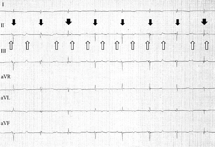 Fig. 2. ECG tracings from a 6-lead ECG examination of the cat during anesthesia and administration of isoproterenol. The cat’s P waves are marked by upward arrows; the P-P intervals were consistent (0.4 seconds). Multiple QRS complexes with narrow negative waves (thin downward arrows) and narrow positive waves (wide downward arrows) were observed. However, both were consistent (0.74 seconds). Paper speed=50 mm/second; 1 cm=1 mV. Under the administration of isoproterenol, ECG tracings revealed an increase in the rate of P waves to 150 beats/minute, with the waves appearing at regular intervals (Fig. 2). The rate of R waves was 81 beats/minute; the R-R intervals were also regular. However, P-R intervals were inconsistent, and P waves were not associated with QRS complexes. Multiple QRS complex morphologies were observed on the ECG tracings. Some QRS complexes appeared narrow and had negative waves. Since the R-R intervals of these QRS complexes indicated a rate of 85 beats/minute, in addition to narrow QRS complexes, these QRS complexes were considered to represent escape rhythm. Other QRS complexes appeared narrow and had positive waves. Positive QRS complex waves occurred at a lower frequency than the negative waves. However, R-R intervals between negative and positive QRS complexes were the same as the interval between negative QRS complexes. These narrow QRS complexes that resulted in the same heart rates suggested junctional rhythm originating from a location higher in the ventricle.
