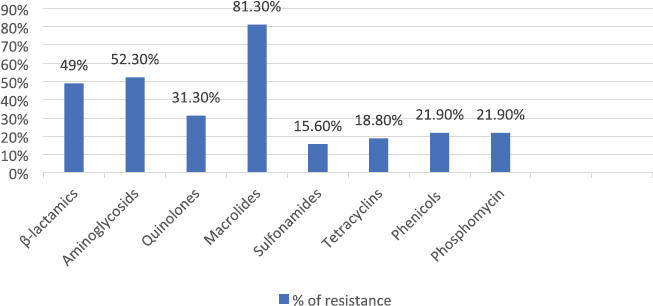 Fig. 1. Percentage of resistance to antimicrobial classes tested. Upon our results, we recommend sulfonamides as the first choice of antimicrobial treatment (Fig. 1). Although there are many studies describing antimicrobial resistance in equine medicine, as far as authors know, none of them focus on the oral microbiota. Furthermore, bacterial resistance profiles change rapidly over time (Canton et al., 2008), remarking the importance of continuous surveillance. The more we know about equine oral microbiota as well the related patterns of resistance, the better we can implement an antimicrobial protocol for some diseases. Moreover, the potential for human to be exposed to resistant bacteria via close contact with horses is a problem that has received much attention (Maddox et al., 2012) Serratia rubidaea strains belong to samples collected from two horses from different stables. Their pattern of resistance demonstrates a phenotypic resistance to all the macrolides, tetracycline and meropenem, one of the carbapenems tested. One of the isolates presented resistance to all the aminoglycosides tested. Serratia rubidaea has already been isolated by Litterio et al. (2012) from an infected wound created by a horse bite in a 2-year-old boy. It is now possible to consider that the origin of this agent could be the horse’s mouth instead of the contamination with soil particles found in the wound. The possibility of wound infection by MDR S. rubidaea after a horse’s bite should be considered in human medicine, particularly in ridders or horse owners. Serratia rubidaea has also been reported as the cause of bacteraemia in a 15-year-old patient by Gentille et al. (2014), and in a 54-year-old patient by Sekhsokh et al. (2007). The Serratia rubidaea MDR profile should be considered in human medicine in cases of bacteraemia caused by this agent. The antimicrobial protocol used should be prudent and always based on microbiologic culture and in vitro antimicrobial susceptibility testing to make sure what is the best antibiotic for that strain. As far as this study goes, sulfonamides, amphenicols, and fosfomycin are good antimicrobial options. Table 1. Resistance rates toward AM classes tested. Only bacterial species with at least 2 tested isolates are shown.