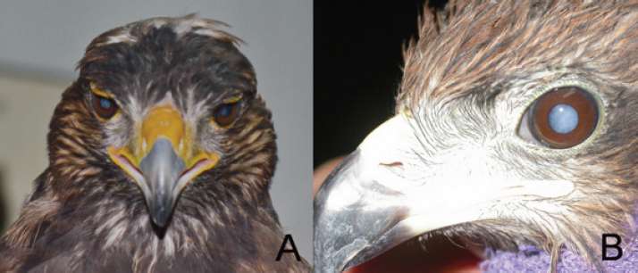 Cataracts are caused by the opacity of the lens and can occur in many species, including birds (Keymer, 1977; Williams, 2008). Causes of cataracts in birds can be congenital, secondary to trauma, electrical injury, nutritional deficiencies, infectious, neoplasia, genetics, aging, and other ocular problems such as uveitis and retinal degeneration (Keller, 1992; Bayon et al., 2007; Dees and MacLaren, 2012). Inherited cataract has been described in canaries (Bayon et al., 2007). In free-living raptors, cataracts frequently occur due to trauma (Murphy et al., 1982; Buyukmihci et al., 1988).