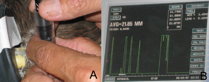 Cataracts can cause blindness in birds. Birds with cataracts lose their ability to navigate the environment or find food resulting in death from emaciation, trauma, or predation (Keymer, 1977). Surgical treatments can cure cataracts. Cataract surgery has been reported in a few birds (Kern et al., 1984; Keller, 1992; Carter et al., 2007; Rainwater et al., 2015; Sigmund et al., 2019). After cataract surgery without intraocular lens (IOL) implantation, the aphakic eye was far-sighted or hyperopic (Brooks, 1997). In addition, the images would be blurry (Brook, 1997). Thus, cataract surgery with IOLs implantation is recommended to restore emmetropia after cataract removal. A-scan biometry should be used to calculate the strength of an IOL. To date, ocular biometry has been reported in only a few birds (Kuhn et al., 2015).