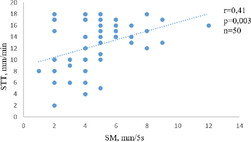 Fig. 3. Individual results of STT and SM in 50 eyes.c On average, STT is higher in dogs, ranging from 20.4 ± 2.89 to 23.56 ± 3.98 mm/minute (Hartly et al., 2006; Visser et al., 2017), than in cats, where it ranges from 13.7 ± 4.6 to 15.7 ± 3.7 mm/minute (Sebbag et al., 2020). This difference possibly correlates with SM results. Rajaei et al. (2018) reported results for dogs where STT averaged 15.10 mm/minute and SM averaged 9.66 mm/5 seconds. However, in cats they reported STT as 11 mm/minute and SM as 10.5 mm/5 seconds. These results for cats do not correlate with those obtained for dogs. As for the cats, the results from STT and SM were similar. In our research, we found a significant medium positive correlation between the STT and SM results for cats (r=0.411; p=0.003) (Fig. 2). The STT and SM results for the individual cats are shown in Figure 3. The SM should be evaluated according to the cat’s eye position—brachiocephalic cats or normaloid cats—and age for more precise results. However, the authors of this study advise clinicians to perform the STT-1 as part of their ophthalmic examination in cats, particularly in cats with an ocular surface disease. More data is needed to assess the values for SM at different stages of keratoconjunctivitis and understand at what level SM values increase during painful conditions. In every case, both the STT and SM should be evaluated according to the animal’s clinical status and the results of other diagnostic tests. Conflict of interestThe authors declare that there is no conflict of interest. Authors contributionsLK conceptualized the aim of the study, designed, planned, and supervised the analysis and corrected the manuscript. LŠ and LK conceived the work and performed all animal examinations and tests. AM analysed the data, prepared the graphs, figures and tables, and drafted the manuscript. All authors read, reviewed, discussed, and agreed to their individual contributions prior to and during submission of this article. AcknowledgmentsThis work was supported by the framework of LLU, specifically: “The effects of drug use habits on the eye microbiota antimicrobial resistance in dogs” (LLU P18). ReferencesAftab, G., Rajaei, S.M. and Faghihi, H. 2018. Comparison of the Schirmer tear test I values after placement in ventral and dorsal conjunctival fornices in healthy cats. J. Feline Med. Surg. 20(12), 1169–1172. Dilly, P.N. 1994. Structure and function of the tear film. Adv. Exp. Med. Biol. 350, 239–247. Dogru, M., Ishida, K., Matsumoto, Y., Goto, E., Ishioka, M., Kojima, T., Goto, T., Saeki, M. and Tsubota, K. 2006. Strip meniscometry: a new and simple method of tear meniscus evaluation. Invest. Ophthalmol. Vis. Sci. 5, 1895–1901. Grahn, B.H. and Storey, E. S. 2004. Lacrimostimulants and lacrimomimetics. Vet. Clin. North Am. Small Anim. Pract. 3, 739–753. Hartly, C., Williams, D. and Adams, V.J. 2006. Effect of age, gender, weight, and time of day on tear production in normal dogs. Vet. Ophthalmol. 9(1), 53–57. Ibrahim, O.M., Dogru, M., Ward, S.K., Matsumoto, Y., Wakamatsu, T.H., Ishida, K., Tsuyama, A., Kojima, T., Shimazaki, J. and Tsubota, K. 2011. The efficacy, sensitivity, and specificity of strip meniscometry in conjunction with tear function tests in the assessment of tear meniscus. Invest. Ophthalmol. Vis. Sci. 5, 2194–2198. Kazama, Y., Wakaiki, S., Washita, H.I. and Saito, A. 2014. A novel method of lacrimal function testing: strip meniscometry. In First International Conference on Ocular Surface Diseases in Dogs and Cat, 2014 March 6–8, Niseko, Japan, 2014. Kovalcuka, L. and Nikolajenko, M. 2020. Changes in intraocular pressure, horizontal pupil diameter, and tear production during the use of topical 1% cyclopentolate in cats and rabbits. Open Vet. J. 10(1), 59–67. Lim, C.C., Reilly, C.M., Thomasy, S.M., Kass, P.H. and Maggs, D.J. 2009. Effects of feline herpesvirus type 1 on tear film break-up time: Schirmer tear test results, and conjunctival goblet cell density in experimentally infected cats. Am. J. Vet. Res. 70, 394–403. Miyasaka, K., Kazama, Y., Iwashita, H., Wakaiki, S. and Saito, A. 2019. A novel strip meniscometry method for measuring aqueous tear volume in dogs: clinical correlations with the Schirmer tear and phenol red thread tests. Vet. Ophthalmol. 22(6), 864–871. Ohashi, Y., Dogru, M. and Tsubota, K. 2006. Laboratory findings in tear fluid analysis. Clin. Chim. Acta. 369, 17–28. Rajaei, S.M., Mood, M.A., Asadi, F., Rajabian, M.R. and Aghajanpour, L. 2018. Strip meniscometry in dogs, cats, and rabbits. Vet. Ophthalmol. 21(2), 210–213. Sebbag, L., Allbaugh, R.A., Wehrman, R.F., Uhl, L.K., Ben-Shlomo, G., Chen, T. and Mochel, J.P. 2019. Fluorophotometric assessment of tear volume and turnover rate in healthy dogs and cats. J. Ocul. Pharmacol. Ther. 35(9), 497–502. Sebbag, L., Uhl, L.K., Schneider, B., Hayes, B., Olds, J. and Mochel, J.P. 2020. Investigation of Schirmer tear test-1 for measurement of tear production in cats in various environmental settings and with different test durations. J. Am. Vet. Med. Assoc. 256(6), 681–686. Visser, H.E., Toffemire, K.L., Love-Myers, K.R., Allbaugh, R.A., Ellinwood, N.M., Dees, D.D., Ben-Shlomo, G. and Whitley, R.D. 2017. Schirmer tear test I in dogs: Results comparing placement in the ventral vs. dorsal conjunctival fornix. Vet. Ophthalmol. 20(6), 522–525. | ||