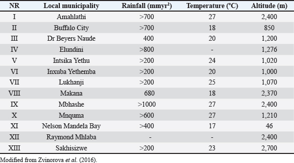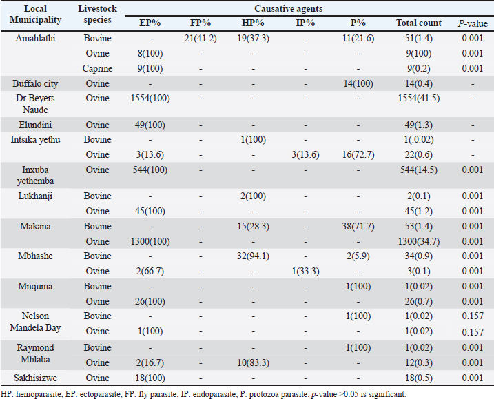 AbstractBackground: Parasites contribute significantly to the decline of livestock production and productivity and consequently hamper the availability of protein food resources. Aim: This study aims to report the prevalence of parasitic diseases in the Eastern Cape Province (ECP), South Africa. Method: Retrospective data of animal diseases in the ECP from 2013 to 2018 was obtained from the veterinary unit of the Department of Rural and Agrarian Reform database, decoded analyzed, and interpreted. Results: The results reveal a significant association (p < 0.05) between local municipality, seasons, year, and livestock species. Endoparasites (75%) were the highest reported in the year 2015, whereas ectoparasites (38.1%) and fly parasites (30.4%) were mostly reported in the year 2016. The highest prevalence of fly parasites and endoparasites was found in autumn (87%) and spring (75%). The local municipalities with the highest prevalence were Amahlathi (fly parasite, 91.3%), Dr Beyers Naude (ectoparasite, 43.6%), Intsika Yethu (endoparasite, 75%), Makana (protozoa, 45.8%), Mbhashe (hemoparasite, 40%), Raymond Mhlaba municipality (hemoparasite, 12.5%), and Lukhanji (fly parasite, 8.7%). Parasitic diseases diagnosed in the province between 2013 and 2018 were babesiosis (1.7%), anaplasmosis (2.1%), distomatosis (0.1%), goat mange (0.2%), and sheep scab (94%). Conclusion: The prevalence of parasitic diseases was found unevenly distributed in the local municipalities of the ECP and mostly diagnosed in autumn and spring compared to summer and winter. This study provides baseline information to guide policy-making on disease preventative actions. The recommended action would include appropriate and timely use of acaricide to mitigate problems associated with parasitic diseases. Keywords: Sheep scab, endoparasites, ectoparasites, anaplasmosis, Eastern Cape Province. IntroductionAnimal parasitosis is a global livestock husbandry problem. Livestock parasites account for 13% of livestock mortality and are generally responsible for reducing animal productivity by reducing the quantity of meat, milk, and other animal products (Grace et al., 2015). Also, parasite infestation leads to poor livestock reproduction and food insecurity (Grace et al., 2015). An estimated $93.1 million is lost to parasite infestation, mainly due to treatment costs and production loss (Zoetis, 2018). A recent South African study reported a loss of 9992.4 USD due to fasciolosis between 2010 to 2012 (Jaja et al., 2017a). Livestock parasites are also associated with human health challenges. Zoonotic parasites like Echinococcus spp, Taenia spp, and Fasciola spp, when present in food, could easily be transmitted to humans, increasing the burden of human infection and mortalities (Torgerson and Macpherson, 2011; Barnes et al., 2017). For instance, a study that investigated the status of neurocysticercosis in Eastern and Southern Africa found that 8.5% were positive for cysticercosis (Mafojane et al., 2003). Previous research established that cysticercosis is associated with epilepsy, and further revealed that 16% of 200 mine workers repatriated because of epilepsy were positive for cysticercosis (Mafojane et al., 2003). There are 1,000 commercial and 13,000 communal farmers in South Africa, contributing significantly to the gross domestic product. Livestock production generates income through livestock sales, drought power, manure, and other socioeconomic activities (Jaja et al., 2016). Hence, it is regarded as a way out of poverty ( Perry and Grace, 2009; Katiyatiya et al., 2014). Parasites, including sheep scabs, constrain sustainable livestock production (Bath et al., 2016). Such constraints are commonly associated with reduced fertility, skin irritation, anemia, and death (Sanhokwe et al., 2016). Many factors have been adduced for the high prevalence of parasites and parasitic diseases in many low and medium-income countries. These factors include warm temperatures, lack of understanding of parasite life cycle, limited management and control approaches, as most anti-parasite drugs do not provide permanent solutions due to parasites’ resistance to drugs (Kumar et al., 2013). Also, indiscriminate, prolonged, and unwarranted use of acaricidal products/medicines enhances parasites’ resistance to drugs (Maphosa and Masika, 2010). Aside from ticks, in South Africa, farmers’ knowledge and ability to manage parasites are very limited. Endoparasites particularly are not perceived as problematic even though animal health authorities responsible for disease management in the region claim the existence of those parasites (Simela, 2012). Ticks are the most reported parasites due to their cosmopolitan nature and ability to cause diverse diseases. Seasonal temperature changes are known to optimize annual tick activity patterns and rapidly influence tick-borne diseases’ dynamics (Hancock et al., 2011). Tick infestations are a growing concern, mainly because of climate change, farming economics, and ecological biodiversity management, which drive changes in their epidemiology and geographical distribution (Taylor, 2012). Hence, communal and resource-poor farmers pay more attention to ticks’ control and underestimate other parasites such as nematodes, trematodes, flies, and protozoa. To the best of our knowledge, there is little research on the epidemiology and prevalence of parasitic diseases in the study area. Hence, this study aimed to determine the prevalence of parasitic diseases in the Eastern Cape Province (ECP), South Africa. Materials and MethodsStudy areaThe study was conducted in ECP, South Africa. ECP is one of the nine provinces of South Africa, located in the southern region of the country. The northern part of the province opens to Free State and Lesotho, northeastern part to KwaZulu Natal, south and southeastern part to the Indian Ocean, and western and northern to the Westside. ECP occupies 13.9% of South African land with 