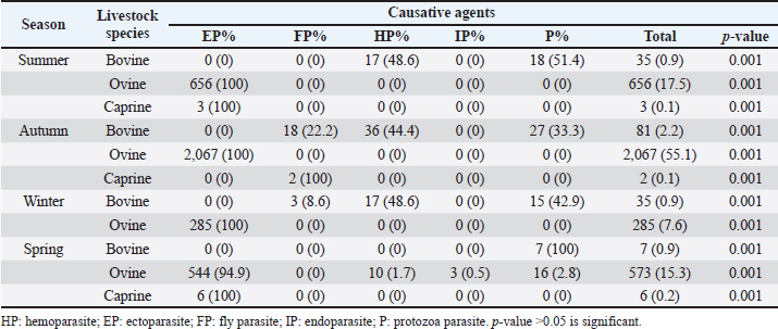 Fly parasites were reported high in the autumn season in Amahlathi and Lukhanji local municipalities. These findings concurred with the report in the study investigating prevalence and distribution of tsetse fly in Nigeria. These studies revealed that fly parasites are more prevalent in areas where the same fly parasites had earlier been eradicated (Oluwafemi, 2012). They show monthly changes in abundance throughout the year and peak in July, one season before the onset of the autumn season (Oluwafemi, 2012). The high prevalence in these regions in ECP could be due to seasonal factors such as altitude and temperature. Also, changing weather patterns, climate variability, and animal movements could shift some parasites and diseases into higher elevations (Scasta, 2015). Although the proportion of protozoa parasites in this study was low, protozoan parasites are a significant cause of abortion and infertility in domestic ruminants resulting in considerable economic losses (Kaltungo and Musa, 2013). Hastutiek et al. (2019) studied protozoa parasites prevalence in low and upland regions and found the highest prevalence (88.23%) in the higher regions. The relatively very low prevalence of protozoa parasites observed in this study could probably be because animals that recovered from some protozoa parasitic diseases might become immune to reinfection (Kaltungo and Musa, 2013). In the present study, the leading hemoparasitic infections were anaplasmosis and babesiosis. Cattle and goats are the most susceptible to hemoparasites, and these parasites cause severe clinical diseases and production losses (Weny et al., 2017). Hemoparasites in the present study were low and widely distributed in many local municipalities and were highest in the autumn season. The low prevalence of hemoparasites in this study is similar to the study conducted in Nigeria investigating the prevalence of hemoparasites in livestock. The Nigerian study recorded a regional prevalence of 38% and a summer prevalence of 64% (Onuekwusi, 2014). The relatively low prevalence of hemoparasitic diseases might be due to underreporting. Also, goats in the study area browse invasive plant species such as Acacia karoo. These plants have been proven as potent anthelminthic agents (Sanhokwe et al., 2016). Communal farmers lack financial resources to cover the veterinary cost (Jaja et al., 2017a). Hence, they make use of ethnoveterinary sources for the management of livestock parasites. In the current study, the prevalence of goat mange was 0.2%. This is in contrast with the findings recorded in the East Harerghe zone (3.4%), Eastern Ethiopia. Mange is a zoonotic parasitic disease caused by mites, which are obligate parasites that affect all warm-blooded animals and man (Anyogu, 2020). It is transmitted through contact with affected animals and or contaminated materials (Zoetis, 2018). Three genera that affect small ruminants include Sarcoptes, Psoroptes, and Demodex. Parasite activities in the host’s skin elicit intense pruritus, which causes a wide range of complications such as mechanical injury from scratching, irritation, dermatitis, and abscess formation due to secondary bacterial infection, weight loss, lameness, anemia, and death in severe cases (Nyangiwe and Horak, 2007). The mange disease is generally seen in animals that are in poor conditions in the pre-summer and summers season (Mana, 2018). Sheep scab is one of the oldest known skin diseases of sheep, and it is caused by either of the mange mites Psoroptes ovis or Sarcoptes scabiei. It is a serious animal welfare condition as parasite activities lead to allergic dermatitis through fecal deposition on the animal’s skin (Dunn et al., 2016). In the present study, sheep scab prevalence rate was 94.5%. This result tallies with a Brazilian study where 66.6%–100% mean intensity of Psoroptes ovis infestation in goats was reported (Amorim et al., 2015). On the contrary, a survey of ectoparasites of goats in the UK only found seven mite and lice infections (Cornall and Wall, 2015). Sheep scab is a controlled disease in terms of the South African Animal Diseases Act of 1984. However, sheep-keeping farmers in the ECP do not fully comply with government regulation on early disease reporting. Sheep scab can only be effectively controlled if all farmers make an effort to obey the law and report incidences timeously. ConclusionThis study found the prevalence of parasitic diseases significantly high in autumn and spring than in summer and winter. Amahlathi, Dr. Beyers Naude, Intsika Yethu, Makana, Mbhashe, and Mhlaba municipalities recorded the highest prevalence of fly parasite, ectoparasite, endoparasite, protozoa disease, and hemoparasitic disease, respectively. On the other hand, Raymond Mhlaba, Lukhanji, Ulundi, Mnquma, Nelson Mandela Bay, and Sakhisizwe municipalities recorded a very low prevalence of parasitic disease. The highest prevalence was reported in 2015 for endoparasites but lowest in 2013, 2016, 2017, and 2018. Parasites are a significant cause of disease and livestock production loss, frequently causing consequential economic loss and affecting animal welfare. Regular and proper use of insecticides, dewormers, and acaricides to control the parasites in ECP is highly recommended an effective preventive or control measures to tame the tides of high parasitic disease prevalence during season active activity. Farmers should be adequately trained on the effective management of animal parasites, acaricides, and veterinary medicines for chemoprophylaxis. Furthermore, strict implementation/enforcement of the South African Animal Disease Act or provision of incentives to farmers who report sheep scabies help to improve the disease reporting system in the study area. Conflict of interestThe authors declare that there is no conflict of interest. ReferencesAmorim, M.G.R. de, Azevedo, S.S. and Riet-Correa, F. 2015. Seasonal prevalence and mean intensity of Psoroptes ovis infestation