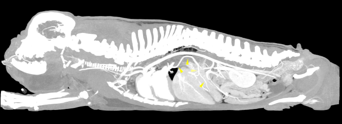 Fig. 1. Sagittal MIP view of the venous phase. The yellow arrowheads indicate the anomalous vessel connecting the portal system with the lobar vein of the caudal left pulmonary lobe.