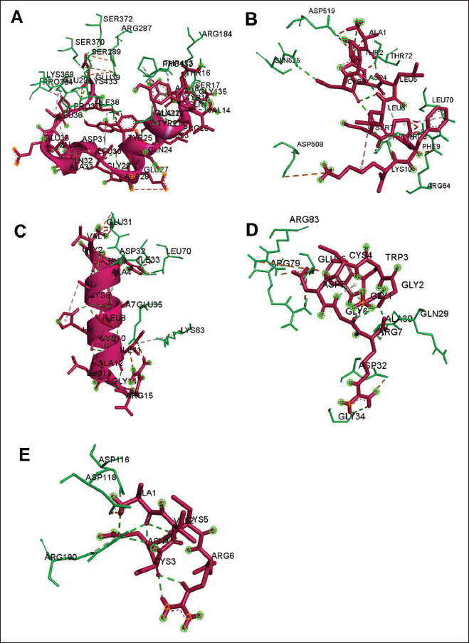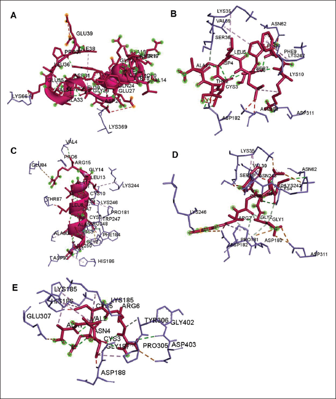 Fig. 5. Interaction between defensin peptide and aerolysin protein. A. 3-defensin-53, B. 59-defensin-68, C. 69-defensin-83, D. 85-Defensin-91, and E. 92-Defensin-97.