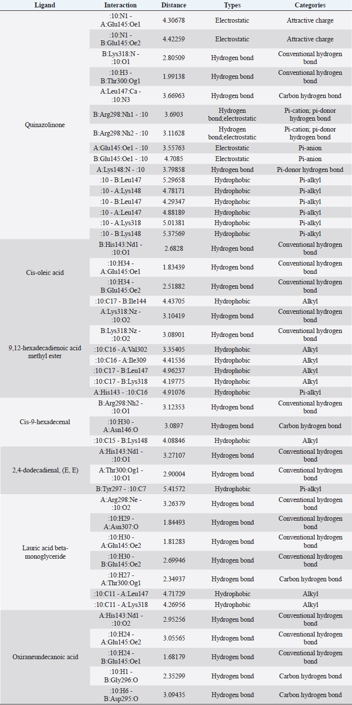 Active ingredients in methanol extract from BSF prepupaeThe study showed that fatty acids in the following percentage were found in the methanol extract of BSF prepupae: myristic acid (21.04), stearic acid (4.62), palmitic acid (25.85), pentadecanoic acid (0.40), oleic acid (18.30), palmitoleic acid (8.58), arachidic acid (0.37), lauric acid (0.03), and linoleic acid (17.6). The highest fatty acids in this study were palmitic acid and myristic acid, while the lowest were arachidic acid and oleic acid. Protein content in the methanol extract of BSF prepupae was 7.44%. Disk diffusion test, MIC, and MBC testInhibition of methanolic extract of BSF prepupae against the growth of S. aureus and MRSA was found at a concentration of 160 mg/ml, indicated by the formation of an inhibition zone (Table 2). The MIC test was not able to determine the ability of the extract to inhibit bacterial growth because the suspension was dark in color at all test concentrations, so the results were read directly from the MBC test, which indicated the killing power or no bacterial growth was found at a concentration of 320 mg/ml. Methanol extract of BSF prepupa could not inhibit growth or kill A. hydrophila and A. salmonicida bacteria at all test concentrations. Molecular docking and analysis of fatty acids to S. aureusThe fatty acids found in BSF are cis-oleic acid, 9,12-hexadecadienoic acid methyl ester, cis-9-hexadecenal, 2,4-dodecadienal, lauric acid beta-monoglyceride, and oxiraneundecanoic acid. The 3D views of those six fatty acid compounds and quinazolinone showed the same binding area as the PBP of S. aureus. These fatty acids and quinazolinone bind to the amino groups of residues Glu 145, Lys 318, Arg 298, Lys 148, Leu 147, His 143, Leu 147, Arg 298, and Thr 300 (Table 3). The bonds between the fatty acid and quinazolinone are electrostatic, hydrogen, and hydrophobic, with the highest affinity of bonds being quinazolinone (Fig. 2). Fatty acid in BSF and penicillin showed inhibition in the same area against DNA gyrase in Figure 2. The same amino acid active site was residues Arg 1048, His 1079, Arg 1047, Glu 1156, His 1079, His 1081, Pro 1044, Arg 579, and Val 1029 (Table 4). The highest interaction of all fatty acids is with IARS consecutively are Cis-oleic acid (−312.533 kcal/mol); 9,12-hexadienoic acid methyl ester (−308.408 kcal/mol) and Lauric acid beta-monoglyceride (−279.856 kcal/mol). This interaction was higher than PBP and DNA gyrase (Fig. 3, Supplementary data in Table 6). There is a favorable bond between Mupirocin and fatty acids in IARS. Mupirocin has a higher binding activity than fatty acids of BSF to IARS. There are beneficial interactions at the same active site between Mupirocin and fatty acids on IARS, namely residues Trp 528, Pro 56, Trp 562, Pro 100, Val 588, and His 64 (Table 5). The highest ligand complex binding energy (fatty acid of BSF, penicillin, quinazolinone, and Mupirocin) to the protein of S. aureus is PBP’s on Quinazolinone, to DNA gyrase is penicillin and to IARS is Mupirocin (Fig. 4; Supplymentary data in Table 6). Molecular docking of peptide defensin to AeromonasProtein defensins like BSF were predicted with peptide cutter and trypsin enzyme to produce 10 peptides with amino acid sequence lengths of 1–53 (unpublished data). Five of ten sequences of bioactive defensin peptides were selected (AVCNCR; GGWCDGR; ATCDLLSPFK; VGHAACALHCIALGR; SVLVLGLIVAAFAVYTSAQPYQLQYEEDGLDQAVELPIEEEQLPSQVVEQHYR). Table 2. Antibacterial sensitivity test of methanol extract of BSF prepupae.