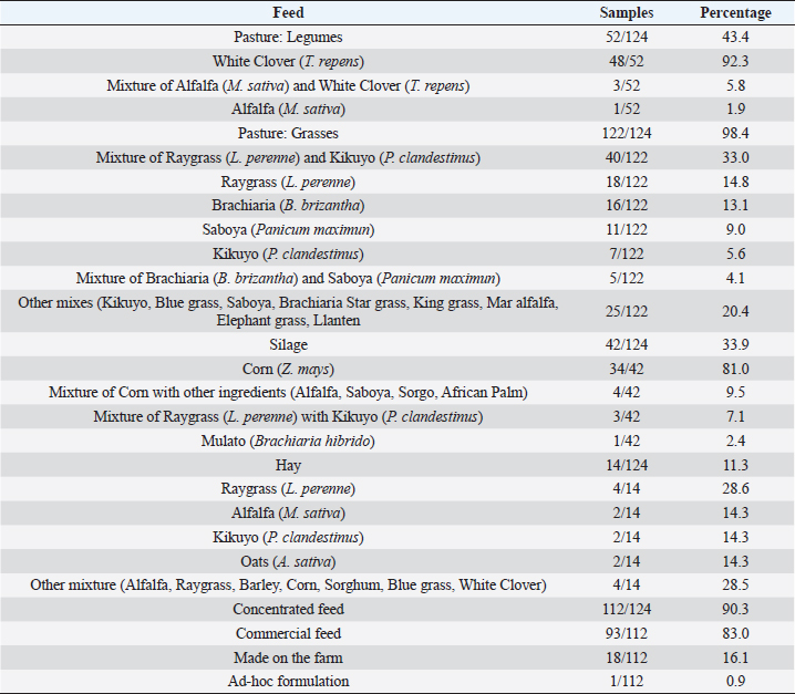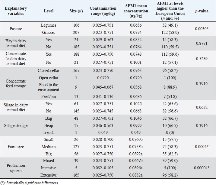 Regarding silage storage, it is known that the fungi develop better when there is poor storage (Kemboi et al., 2020). This favors their growth, particularly when there is an inadequate sealing of the silo, holes in the packaging, or inadequate storage facilities (Variane et al., 2018). The warmer and more humid environmental conditions inside the silo are also more favorable for the development of fungi (Pereyra et al., 2008). Our survey determined that the largest number of farmers store it in bags, and this corroborates the reports of several authors who found the highest percentage of contamination with AF occurring in products ensiled in bags, mainly after long and inadequate storage periods (Fink-Gremmels, 2008; Prandini et al., 2009; Baliukonien et al., 2012). These periods are notably influenced by harvest time of corn, fertilization, irrigation, pest control, and silage moisture (Prandini et al., 2009). In relation to the use of hay, various studies have determined that it is a feed where Aspergillus can grow, and therefore, the presence of AF can be found (Tsiplakou et al., 2014; Dhakal and Sbar, 2020). In several studies, alfalfa hay has presented AFB1 at levels higher than the maximum limit allowed by the European Union (Sugiyama et al., 2008; Bani Ismail et al., 2020; Rodríguez-Blanco et al., 2020). In the case of Ecuador, the most used ingredients were Alfalfa and Raygrass. Table 2. Explanatory variables included in the analysis of risk factors for occurrence of AFM1 in raw Ecuadorian milk (n=209).