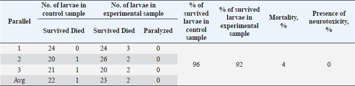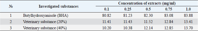 The ARA of the investigated substances was compared with the ARA of butylhydroxyanisole (BHA). The values of the antiradical effect of substances, calculated by the formula (2), are given in Table 4. Based on the analysis of the data from Tables 5–7 and Figure 1, it is evident that 20% and 40% of veterinary substances have low ARA compared to BHA. Based on the experiment conducted, it can be assumed that the resulting composition (40%) does not exhibit cytotoxicity in all tested concentrations. The larvae remained alive, but their activity was significantly inhibited. The next stage in the study of the obtained drug was the study of pharmacotherapeutic activity in the treatment of subclinical mastitis in dairy cattle. The study of milk samples for the detection of a subclinical form of bovine mastitis during the interlactation period, as well as the prophylactic and therapeutic efficacy of the drug, was carried out according to standard methods—sampling for a somatic test, sampling for a Lange test, and a sedimentation test. In order to determine the therapeutic dose of the drug, two groups of animals with a subclinical form of mastitis, five animals in each, were selected. At the same time, the animals from the first group were injected with the drug “Mastometrin” at a dose of 5 ml, the animals from the second group were injected with the obtained substance at a dose of 5 ml. The mammary glands of animals of both groups were exposed to the “Aquaton” apparatus with an exposure time of 15 minutes. Clinical observation of the animals (BT, pulse, and respiration rate) was conducted daily for 6 days. A comparative treatment regimen for bovine mastitis is presented in Table 8. As a result of the therapeutic measures, it was found that cows with subclinical mastitis showed recovery at different times (Table 9). Thus, in the animals of the second experimental group, the inflammatory processes in the lacteous gland decreased much earlier than in the animals of the first experimental group. Table 3. Change in optical density of the investigated substances with change in concentration.
