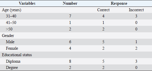 AbstractBackground: Due to its affordability in disease-affected communities and suitability for field application, microscopy has historically been considered the gold standard for field diagnosis of trypanosomosis in rural settings. Aim: This works aims to compare the performance of microscopists on bovine trypanosome microscopy by organizing the first comparative assessment on a correct reading of slides by laboratory professionals using the read slide results and a structured interviewer-administered questionnaire in North-central Nigeria. Methods: Ten participants were addressed, as they were sent a panel of two slides (Slide 1: No Trypanosome present; Slide 2: Trypanosome present) and a questionnaire. Results: All participants greater than 41 years old reported correctly the presence and absence of parasites on slides. Only 3/8 of microscopists from routine diagnostic laboratories reported correctly the presence of the parasite. Conclusion: Our study confirmed errors in reading slides. Therefore, training of microscopists besides a nationwide quality assessment is recommended. Keywords: Blood film microscopy, Bovine trypanosomosis, North-central Nigeria, Performance, Evaluation. IntroductionTrypanosomosis is considered the most important constraint to the health and improved productivity of cattle in sub-Saharan Africa (Taylor, 1998). It is ranked among the most important genera of hemoparasites of veterinary importance affecting cattle (Bakre et al., 2020). The disease is characterized by fever, anemia, reduced productivity, and frequently high mortality, which among the other factors limit the development of rural areas in tropical Africa (Abenga et al., 2002; Fajinmi et al., 2007). As of 2011, the annual financial burden of animal trypanosomosis in Nigeria was estimated to be above 22 million dollars (Fadiga et al., 2013). In the southern states, African animal trypanosomosis (AAT) prevalence values ranged between 2.7% and 35.45% (Opasina and Ekwuruke, 1987; Unigwe et al., 2022). In northern states, trypanosome prevalence using microscopy is 0.8% in Bagudo local government of Kebbi state (Yusuf et al., 2015), 26.67% in Song local government of Adamawa state (Zubairu et al., 2013), 2.2% in Kaduna central (Samdi et al., 2011), and 1.8% in Sokoto main abattoir (Fajinmi et al., 2011). Similarly, prevalence rates of 8.4% (Enwezor et al., 2009) and 3.98% (Machina et al., 2017) have all been reported in Kaduna state. Trypanosoma vivax is reported to be the dominant species in ruminants in most parts of northern Nigeria (Omotainse et al., 2004). AAT is being controlled by chemotherapy or targeting the tsetse fly (Steverding, 2008). However, the effect of PATTEC Nigeria, which was officially inaugurated at the 26th ISCTRC conference in 2001 on trypanosomosis and tsetse elimination, is not yet felt among local farmers considering the financial limitations (Odeniran, 2022). Diagnosis is an essential element in disease’s management among animal populations. Microscopy-based techniques using direct observation of wet blood films, buffy coat technique (BCT) (Murray et al., 1977), or hematocrit centrifugation technique (Woo, 1970) are the most common methods of parasite detection. Although its main drawbacks reflect in its analytical sensitivity (low analytical sensitivity in chronic infection and nil in healthy carriers), microscopy is the ideal diagnostic technique for bovine trypanosomosis because it is suitable for field application and has test cost within the means of the communities affected by the disease (Hailu, 2019; Desquesnes et al., 2022). For this reason, microscopy has historically been considered the gold standard for field diagnosis in rural settings. In rural areas, the quality of microscopy in trypanosomosis endemic areas is often inadequate because of poor quality equipment, insufficient training, and lack of quality assurance (Rosenblatt et al., 2009; Moura et al., 2014). External quality assessment (EQA) is a quality assurance method for objectively checking the laboratory’s performance through panel testing, blinded rechecking of slides, and on-site supervision. Studies by Mukadi et al. (2013) showed that EQA methods were feasible and acceptable to improve the quality of blood film microscopy. In 2002, the World Health Organization (WHO) launched an EQA program to improve the proficiency of microbiological testing for diseases prone to cause epidemics in the WHO Africa Region (Frean et al., 2012). The first and second national large-scale EQAs on trypanosomosis were done in humans in The Democratic Republic of the Congo (Mukadi et al., 2011, 2016). However, such assessments have not focused on the microscopy-based diagnosis of diseases of economic importance in animals. Hence, this study aims to assess the ability of microscopists to detect and identify Trypanosoma brucei in infected cattle and point out quality improvement areas in microscopic diagnosis for effective case management and control of the disease. Materials and MethodsStudy designBetween July and October 2021, 10 clinical laboratories in the country’s North-central part of Nigeria were contacted. Laboratories were recruited from both public and private sectors, and this was based on accessibility, security, and voluntary participation. Collected samples were analyzed in the laboratory using two different methods [microscopy and polymerase chain reaction (PCR) for confirmation]. Slides were read by two microscopists using Olympus Microscope CX23 (Japan), questionnaires responses were recorded, and all data was analyzed (Fig. 1). Sample collectionUsing the ear and jugular vein of each of the five cattle used for the study, the demonstration of the presence of T. brucei was done using a buffy coat (Woo, 1970) and the Giemsa staining method (Wilson, 1969). To maintain quality, slides were prepared, viewed, and double-checked by two professional microscopists before it was sent out to the participating lab