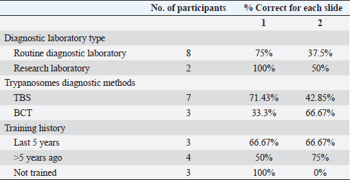 Table 2. Questionnaire results according to diagnostic laboratory type, Trypanosoma diagnostic method, and participation in recent training on microscopy.