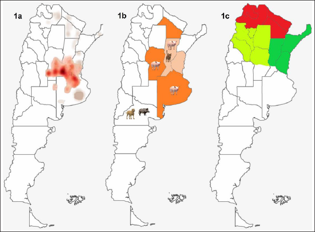 Fig. 1. Swine and farms distribution in Argentina. (a) Swine distribution around the country; (b) the major area of swine production is shown in orange and the area intense orange covers the major number of PUs. Also, the locations of cases detected in this study are indicated by the animal's images. (c) Red and green color indicate the areas of the higher and minor percentages of PRV prevalence, respectively. Evidence of viral circulation in commercial farms is based on antibody detection in the context of the National Control Program. A commercial ELISA (IDEXX PRV/ADV gI or CIVTEST SUIS ADV gE Hipra), which differentiates infected from vaccinated animals, is routinely used. Commercial farms with more than 100 sows must be checked by ELISA every 180 days from samples collected from sows and fattener animals. Thanks to this program, the different regions from the percentage of seroprevalence were detected. For that, a total of 12,919 samples were collected from 1,003 farms, representing 97% of swine stock. Antibodies against PRV in wild boarsFrom 2018 to 2019, 78 wild boars were captured (22 males, 39 females, and 17 not identified) from Bahía de Samborombón natural reserve, located in the Buenos Aires province. Serum samples were analyzed for antibody PRV detection using a virus neutralization test, according to Serena et al. (2018). Recent clinical cases reported in ArgentinaBased on samples submitted to the participating laboratories of this study (Virology of the School of Veterinary Sciences of La Plata, Buenos Aires-INTA Marcos Juárez, Córdoba), from 2013 to 2019, only four positive clinical cases with PRV isolation were detected. All of them were inspected and reported by private practitioners, who collected and submitted the samples to the laboratories. Case 1: Case 1 occurred in 2013 in a 50-sow backyard farm located in the Buenos Aires province. Typical PRV signs were detected in 60-day-old pigs and included neurological signs such as tremors, opisthotonos, and limb stiffness. Samples from the brain and trigeminal ganglia were collected at necropsy and sent to the Virology Laboratory of the School of Veterinary Sciences of La Plata, Buenos Aires. Case 2: Mortality associated with central nervous signs was reported in hunting dogs in the Neuquén Province in 2017. The head of two feral swine and a dog were submitted to the laboratory. Samples from the brain and trigeminal ganglia were analyzed. Case 3: Case 3 was detected in 2019 on a 100-sow farm located in the Santa Fe Province. The clinical case was characterized by the neurological signs in piglets (15 days old) that were detected. A cat from the farm was also found dead. Seven samples of the brain and trigeminal ganglia of piglets and the cat's head were submitted to the laboratory. Case 4: Case 4 was associated with an intensive swine farm. In March 2019, an increase in mortality in fattening pigs was noticed. In the following 2 weeks, mortality also increased in the nursery and weaning pigs. These pigs showed central nervous and respiratory clinical signs (lethargy, opisthotonos, incoordination, anorexia, fever, and dyspnea). The farm owner reported the sudden death of several cats and a dog. The geographical location of each case and PUs by province is presented in Figure 1b. PCR detection and phylogenetic analysisIn each laboratory, samples were individually processed, DNA was extracted using commercial kits (High Pure PCR Template Preparation Kit, Roche Diagnostics, Mannheim, Germany) and PCR was used to detect the gD gene. For sequence analysis, the gC partial gene was amplified as described by Serena et al. (2018). The PCR products were purified according to the manufacturer's protocols using Wizard SV Gel and PCR Clean-Up System (Promega, Madison, WI), and sequences on both strands were obtained by the Big Dye Terminator V 3.1 sequencing kit (Applied Biosystems, Germany) with the same primers used for amplification. The sequences were analyzed on an ABI3130XL genetic analyzer (Applied Biosystems, USA), at the Unidad de Genómica, INTA Castelar, Argentina. The sequences obtained were edited using BioEdit software, version 7.2.1. In total, 110 PRV sequences from different geographical locations, including the old Argentine strains, were downloaded from GenBank (https://www.ncbi.nlm.nih.gov/genbank/ accession date 06/05/2022). Partial sequences of the gC gene were aligned in the MEGA X program, using the ClustalW algorithm (Kumar et al., 2018). The phylogenetic trees were constructed using the same program as the Maximum Likelihood method and JTT matrix-based model. The nucleotide sequences obtained in this study were submitted to GenBank. ResultsRegions of Argentina according to seroprevalenceThe first two stages of the eradication plan determined that the national prevalence of positive farms was 19.1% and that the disease was more prevalent in small-scale farms. The Northern region of the country including Jujuy, Formosa, Chaco, and Salta provinces, red color in Figure 1c, which is characterized by small-scale or subsistence production farms, and only represents 26% of PUs of Argentina, presented the major proportion of positive farms (45.2%). While a minor prevalence was detected in the two regions colored in green (dark green, 7.4%, and light green, 9.4%, respectively). The region in dark green represents the north of Santa Fe, Entre Rios, Corrientes, and Misiones provinces; and the region in light green includes the north of Cordoba province and Catamarca, La Rioja, Santiago del Estero, and Tucumán provinces. The percentage of farms located in each region is 16.9% and 18.6%, respectively (Fig. 1c). Evidence of PRV circulation in wild boarsFrom the 78 serum samples collected, only 75 were useful for neutralization tests, as 3 of them were contaminated. The seropositivity of wild boars from the samples collected in Bahía de Samborombón was around 41%, most samples which tested positive were female. Phylogene