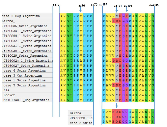 Fig. 2. Analysis of amino acid sites involved in the adaptive evolution of PRV. The amino acid position (75, 76, 191, and 194) was analyzed and compared with Bartha, Becker, and NIA-3 reference strains. The changes are shown in the alignment with an arrow. DiscussionThe swine industry has had great growth in Argentina during the last decade. In addition, it couples high-density farming with international trade, generating a higher risk of transmission and potential risk of the global spread of diseases (He et al., 2019). In Argentina, the number of swine has increased significantly, most of the intensive swine farms are located in the major production area of the country (central region). In contrast, about 92% of farms are represented by subsistence, small and medium producers that lack biosecurity and sanitary measures and control. In these kinds of farms, the contact between man, pig, and other domestic and feral animals is very close, which increases the risk of interspecies disease transmission. Nevertheless, these farms represent 20% of the country's pig population (https://www.argentina.gob.ar/sites/default/files/110_1-caracterizacion_porcinos_marzo_2022.pdf). The recent reports of human cases show evidence that people who work with swine, in particular in backyard production, should increase awareness of the risks of not using self-protection (Yang et al., 2019b). The seroprevalence of PRV reported by SENASA is about 19% and it is mainly associated with small-scale farms of 11–50 sows. Besides, the highest seroprevalence was detected in regions with small-scale or subsistence farms (IF-2022-74239096-APN-DPYESA#SENASA). The low seroprevalence detected in commercial farms with more than 100 sows suggests that the national eradication program, based on serological studies, vaccination, and passive vigilance, is in fact working. However, this report informed that the most recent cases of PRV were detected in the central region of our country where pig production is most concentrated. It is important to mention that all the cases came from small-scale farms that lack appropriate biosecurity measures, backyard farms. or wild boars. These findings suggest that the control program should be reformulated and directed to small-scale farms or wild boar reservoirs.