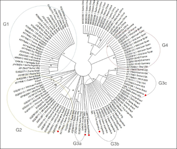 Fig. 3. Phylogenetic analysis of the partial gene encoding the gC protein. Maximum likelihood tree using JTT matrix-based model was constructed by MEGA X software. Groups and subgroups of clade 1 are marked with circular lines. The sequences isolated in this study are indicated with a red dot. In relation to PRV in feral pigs and wild boars, studies from the USA and Europe describe seroprevalence between 0.3% and 66% at the national or regional level depending on the sample size (Müller et al., 2011). In Argentina, neither national nor regional studies have been performed. Since 2009, SENASA evaluated sera samples of a wild boar for PRV detection. However, the number of samples and regions analyzed is low. The study in Bahía de Samborombón revealed a high percentage of detection, but the sampling is not representative of that of the rest of the country. Notwithstanding, it provides important information on PRV circulation in this population. Therefore, a systematic sampling effort of wild boar throughout the country should be included in the national program control. Recombination events have been reported in China in 2011, between wild strains and vaccine strains as well as the re-emergence of PRV in Bartha-vaccinated pig farms (He et al., 2019). Of the 15 strains of PRV reported in Argentina, 13 are closely related to the NIA-3 vaccine strain, and the risk of recombination is possible. Although in Argentina only the inactivated Bartha vaccine is allowed, recombination risk should not be ignored if attenuated vaccines are incorporated into the National control plan. In addition, these potentially recombinant strains may cause virulence enhancement, immune failure, and an increase in cross-host transmission (Skinner et al., 2001). Interspecies transmission has been previously reported in Argentina (Serena et al., 2018). In this report, we detected and characterized two strains, one taken from a cat and one from a dog sample, directly related to infected swine. The genomic characterization of PRV strains originating from swine and other mammals might help better understand the population diversity and facilitate tracing the infection chain back to its origin (Sozzi et al., 2014). The gC gene is a major gene that has been commonly used for the phylogenetic analysis of PRV due to its high variability (Ye et al., 2015). According to other authors, the phylogenetic analysis of partial sequences of the gC gene is a suitable approach for PRV genotyping. In this report, the phylogenetic analysis showed similar patterns as described by others who analyzed the complete gene of gC (He et al., 2019; Zhai et al., 2019). Furthermore, the molecular characterization of new Argentine strains showed no differences from the oldest Argentine PRV strains reported in our previous studies. The Argentine strains formed two different groups inside clade 1 related to NIA-3, Becker, and the USA strains. Moreover, one new Argentinian strain (case 3 swine) is closely related to wild boar strains, suggesting a possible origin from wild pigs. A few amino acid sites were identified with important functions related to the virus infection at cells and four of them are involved in adaptive evolution after cross-host transmission (Karger and Mettenleiter 1993; Flynn and Ryan 1996; He et al., 2019; Zhai et al., 2019). This study involved all amino acid sites of gC described previously that contributed to the grouping of the strains. The case 3 swine in the amino acid positions 75, 76, 191, and 194 showed the same change of amino acid that wild boar strains forming a branch inside of the G2 group. Besides, all these amino acid sites were identical at the Bartha strain. However, case 3 cat maintained the amino acid sequence as older Argentinean strains included in this analysis, suggesting a domestic swine origin. The presence of PRV inside of farm-related to case 3 was demonstrated by the detected virus from animals with clinical signs according to disease. A distinct origin of these two strains is possible because the samples were collected from different animal species. Moreover, when the virus is active in a farm located in a major area of swine production, it is likely to detect different strains. This report provides important information about PRV in Argentina, which may lead to a better understanding of the dynamics of the virus. PRV infection is still present in the country, particularly in regions with small-scale or backyard swine production. This situation will require sanitation and control strategies different from those recommended for intensive high-scale farms. Although PRV outbreaks in swine in Argentina are few, new strains were detected and while the molecular characterization of gC was suitable for carrying out our aim, in the future it will be necessary to include other genes for analysis more exhaustive. This report shows the importance in that continuing with control programs should be emphasized. In particular, programs that aim to eradicate a recent disease is considered zoonotic risk. AcknowledgementsThis work was supported by Proyectos de Incentivos Docentes V260 from Universidad Nacional de La Plata, Argentina; PICT 2019-2756, from Agencia de Promoción Científica y Tecnológica, Argentina and Proyectos PE-I003-INTA and PD-I103- INTA, Instituto Nacional de Tecnología Agropecuaria. Conflict of interestThe authors declare that there is no competing interest regarding the publication of this paper. Author contributionMSS: conceptualization, validation, investigation, formal analysis, writing, review and Editing; JC: methodology and validation, writing, review and editing, supervision, funding acquisition; MF: sampling collection; MW: sampling processing; MD: resources, formal analysis; RB: sampling collection; GEM: investigation and validation; CGA: investigation and validation; AP: review & editing, supervision; BNC: sampling collection (wild boar); MGE: writing, review and editing, Funding acq