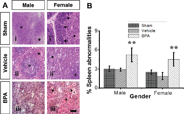 Fig. 4. Representative photomicrographs of the adult male and female microanatomical structures and histopathological findings of spleens in control and BPA-treated mice. (A) H&E-stained sections show lymphohistiocytic infiltrate of red pulp with multifocal erythrocytes extravasation (asterisk), multifocal hemosiderosis (arrow), and prominent extramedullary hematopoiesis of the spleen (arrowhead) in male and female BPA-treated mice (panels iii and iii`) compared to male and female control mice (panels i and ii`), revealing prominent lymph follicles (asterisk) and red pulp (stern) with easily discernable periarteriolar lymphocyte sheaths (arrow) and extramedullary hematopoiesis of the spleen (arrowhead). Scale bars indicate 100 μm, 100×. (B) Percentages of mice with spleen abnormalities. Data are shown as mean ± SEM (n=12 per group). *Significantly different from same sex control (p ≤ 0.05) by Dunnett’s multiple comparison test.