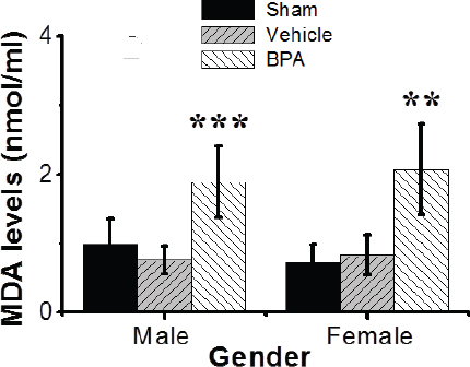 Fig. 6. Effects of BPA exposure on oxidative stress biomarker (MDA) levels (nmol/ml) in the splenic tissues of control and BPA-treated groups. MDA levels (nmol/ml) were examined with the mean ± SEM presented (n=12 per group). Data are shown mean ± SEM (n=12 per group). *Significantly different from same sex control (p ≤ 0.05) by Dunnett’s multiple comparison test. Analysis of DNA fragmentationNuclear DNA from mouse groups was analyzed by agarose gel electrophoresis (Fig. 5A). DNA from the sham and vehicle control-operated spleens was largely intact and exhibited no/little internucleosomal DNA fragmentation (Fig. 5A, lanes 1 and 2). However, DNA from the BPA-exposed group exhibited a characteristic nucleosome ladder, which might have resulted from DNA endonucleolytic digestion (Fig. 5A, lane 3). A smear pattern resulting from random DNA degradation suggests that necrosis might have occurred concurrently with apoptosis. There was no difference in the DNA integrity between adult males and females in all mouse groups. Quantitative analysis showed that BPA-exposed mice exhibited a significant decrease in the DNA concentration, i.e., 1.4-fold, compared to control mice. Still, the vehicle alone had no significant effect when administrated under control conditions (Fig. 5B). There was no difference in the DNA concentrations between adult males and females in all mice groups investigated. Effects of BPA on oxidative stress indices in the spleensHere we found that early-life exposures to low-dose BPA resulted in a significant (p < 0.01) increase in the levels of spleen MDA, a marker of oxidative lipid damage, compared to the control group (Fig. 6). DiscussionA growing body of evidence indicates that exposure to environmental chemicals can cause serious detrimental effects on different body systems (Camarca et al., 2016; Maamar et al., 2016; Al-Griw et al., 2017; Gassman, 2017). The endocrine-disrupting chemical BPA has specifically received increased attention due to its worldwide distribution with large exposure (Camarca et al., 2016). Human exposure is thought to be virtually ubiquitous (Gassman, 2017). Numerous studies have suggested links between BPA exposures and metabolic disorders, such as obesity and diabetes, and cardiovascular diseases (Inadera, 2015; Gassman, 2017). Due to the lack of knowledge of mechanisms and modes of action that might explain the varied and pleiotropic effects reported after BPA, this study aims to use an in vivo model to elucidate the possible molecular mechanism of splenic tissue injury induced by the environmentally relevant level of BPA exposures using a novel murine animal model. Our study demonstrates that early-life exposures to a low dose of the environmental toxicant BPA resulted in abnormalities in the spleens of male and female mice at adulthood based on the nontoxic a pharmacological dose 0.1% of the oral LD50 for BPA (Vom-Saal and Hughes, 2005; Sadowski et al., 2014). These findings are based on careful evolutions using different approaches, including spleen histology, oxidative stress biomarker MDA, and nuclear alterations, related to splenic tissue damage molecular mechanisms in all mice groups studied. For example, BPA induced alterations in peripheral blood cell counts. Lipid oxidative stress biomarker and apoptosis were significantly increased in the BPA-treated mice compared to controls. The in vivo models used to study the toxicity of chemicals are of great importance because animal systems are extremely complicated, and the interaction of chemical compounds with biological components could lead to unique bio-distributions and some disturbances in immune responses and metabolism. As a result, when assessing the immunomodulatory actions of endocrine disruptors in a specific organ or cell type, choosing an appropriately sensitive animal model to evaluate the toxicity of environmental chemicals with adverse health risks at birth or later in life has proven to be an essential factor for generating informative data. Immunotoxicity screening studies must be able to distinguish sex-specific immunomodulatory effects of endocrine disruptors due to the known sexually dimorphic nature of immunological responses and concerns related to individual susceptibility. As a result, based on known differences in responses and sensitivities, all endpoints studied here were addressed individually for male and female mice. Exposure to BPA was found in both male and female mice, with sex-specific effects of BPA exposures observed in both males and females (Suttie, 2006; Gear and Belcher, 2017). Exposure to environmental toxicants can significantly affect human health even at low environmental doses, which may not be apparent at higher doses used in traditional toxicological studies (Camarca et al., 2016). The US Environmental Protection Agency and the European Food Safety Authority have established a tolerable daily intake, or reference dose, of 50 mg/kg/day for BPA as a “safe dose.” However, several researchers suggested that BPA at such a dose causes various adverse effects (Vom-Saal and Hughes, 2005; Sadowski et al., 2014). Fetuses and/or newborns are more sensitive than adults, and exposure to chemicals during critical stages of development may cause irreversible long-lasting consequences (Newbold, 2004; Koike et al., 2018). Despite this body of evidence, the health risks associated with chronic and low dose exposures to BPA remain controversial (Gassman, 2017). In the present study, we chose an in vivo murine model to investigate the long-term impacts of early-life exposures to low-dose BPA (50 μg/kg/day, ip, for 6 weeks) on the spleens of male and female mice in adulthood. Our study shows that BPA exposure associates negatively with increased body and spleen weights of adult male and female mice. Prenatal and early postnatal BPA exposures have been linked to increased body weight in rats in several studies (Magliano and Lyons, 2013; Picard and Turnbull,