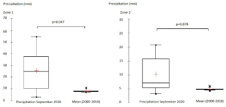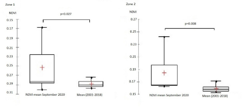 Fig. 3. Zone 1 Box plots of NDVI values recorded in September 2020, mean value=0.207 (0.160–0.293), significantly higher than the mean for the same period registered between 2001 and 2018, mean=0.172 (0.163–0.186), p value=0.027 (Wilcoxon Rank Sum Test for paired samples p value < 0.05). Zone 2 Box plots of NDVI values recorded in September 2020, mean value=0.185 (0.163–0.242), significantly higher than the mean for the same period registered between 2001 and 2018, mean=0.159 (0.153–0.173) p value=0.008 (Wilcoxon Rank Sum Test for paired samples p value < 0.05).