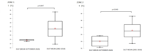 Fig. 5. Box plots of DLST during September 2020 and compared to the mean of 2002–2018. In zone 1, the DLST recorded in September 2020, 33.81°C (33.53–33.97) is significantly lower than the mean 36.61°C (32.88–40.57) p value=0.047. In the zone 2, the DLST value recorded in September 2020, 33.52°C (32.28–34.62) is significantly lower than the mean for the same period recorded between 2002 and 2018, mean=37.15°C (33.41–41.23) (Wilcoxon Rank Sum Test for paired samples p < 0.05). Based on the LRM, our findings demonstrated that the key factors that contributed significantly to BT cases distribution among delegations in Tunisia included DLST and NDVI. The distribution of BT cases in delegation is directly associated with a favourable larval and adult habitat of C. imicola. Such observations are quite expected given that vegetation and temperature are among environmental variables related to the high risk of BT outbreak by favoring vector abundance (Diarra et al., 2018; Ciss et al., 2019; Cuéllar et al., 2020; Gahn et al., 2020). The distribution of BT in the Tunisian delegation seemed to be not significantly related to sheep and cattle distribution. But a positive correlation between the probability of BT occurrence and the sheep distribution was demonstrated. This result is in line with the study conducted by Ma et al. (2019). They demonstrated that areas with sheep density higher than 500 heads/km2 were found to be areas of high risk for BT distribution (Ma et al., 2019). In 2007, during the epidemic in southern Spain, a significant increase in BTV-1 transmission in certain areas correlated with higher densities of sheep (Napp et al., 2016). The role of cattle density, despite its possible role in the BTV distribution (Jacquot et al., 2017), is yet to be clarified in the Tunisian epidemiological context. No significant association with elevation was demonstrated in this study. However, this finding is considered low reliability due to a methodological issue that considers the mean elevation in each delegation (mean=200 m). It is assumed that C. imicola is highly abundant in lower altitudes (Verhoef et al., 2014; Cuéllar et al., 2018). Environmental variables proven to be associated with BT distribution were better elucidated in two different bioclimatic floors in Tunisia, the Sahel and the Centre, the most affected areas in 2020. NDVI, DLST, and precipitation values recorded in September 2020, considered as the risk period, were downloaded and compared to the mean average values of these factors for the same period. Our findings showed that NDVI values recorded in September 2020, 0.207 (0.160–0.293) and 0.185 (0.163–0.242), respectively, in the Sahel and the Central of Tunisia, were significantly higher than the mean average; 0.172 (0.163–0.186) and 0.159 (0.153–0.173) respectively in zone 1 and zone 2. In line with our results, more sparsely vegetated habitats with values ranging between 0.27 and 0.31 and low forest cover that was exposed to full sunlight in Italy supports the occurrence of adult populations of C. imicola (Conte et al., 2007). NDVI importantly inform on vector distribution that can be interpreted from the requirements of C. imicola for the humid organically enriched area as breeding sites (Kameke et al., 2017). Significant high values of NDVI recorded in the Sahel of Tunisia were correlated to significantly high precipitation amounts recorded in the same period (3.08–54.62 mm) in this region. In seasons of above-average precipitation, the species C. imicola can increase its population size 200-fold (Meiswinkel, 1996). The role of precipitation was also reported in the prediction model of BT spread in Spain (Acevedo et al., 2010). However, the Centre of Tunisia demonstrated no evident correlation between NDVI values and precipitation amounts. Significant high NDVI values registered in this period may be related to the irrigation practice in this region. Sidi Bouzid region, in the Central of Tunisia, is a good example of this situation. Indeed, Sidi Bouzid is known for its agricultural-based economy. The agriculture sector in this region is reinforced by the abundant water resources to irrigate large areas and fertile farmland. Irrigation practice is a critical factor for C. imicola in the risk period. Super abundant C. imicola is especially found in irrigated pastures on clayey, moisture-retentive soils where livestock is present. In countries around the Mediterranean Basin, it was confirmed that C. imicola prefers a semi-moist muddy habitat (Braverman et al., 1974). It breeds in small seepages with little free surface water created by leaks from irrigation pipes and covered by fresh grass growth (Mellor and Pitzolis, 1979). When compared to other species of Culicoides, C. imicola is found to generally prefer drier habitats. The DLST recorded in September 2020; 33.81°C (33.53–33.97) and 33.52°C (32.28–34.62) respectively in the Sahel and the Centre of Tunisia, were significantly lower than the mean average in the two zones, 36.61°C (32.88–40.57) in zone 1 and 37.15°C (33.41–41.23) in zone 2. For BT, the temperature was shown to be an important factor in determining the magnitude of the basic reproduction number R0 (Pioz et al., 2012). The distribution of C. imicola is highly dependent on-air temperature, a major limiting factor. However, the precise mechanism of this dependency is not yet known (Van Doninck et al., 2014). Previously conducted laboratory studies revealed that vector competence varies with temperature and infecting BTV serotype. Vector competence for BTV-4 is lower than that for BTV-1 after incubation at 23°C–25°C (Paslaru et al., 2018). The optimal temperature of 37°C for the infectious blood during artificial feeding of Culicoides was reported by several studies (Venter et al., 1991; Goffredo et al., 2004; Balenghien et al., 2014). In 2018, it was demonstrated that, at 37°C, species of Culicoides hardly took blood