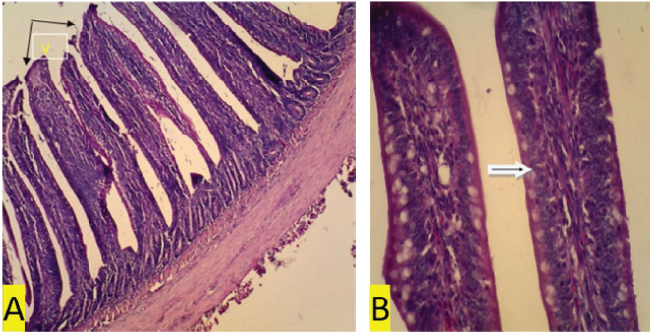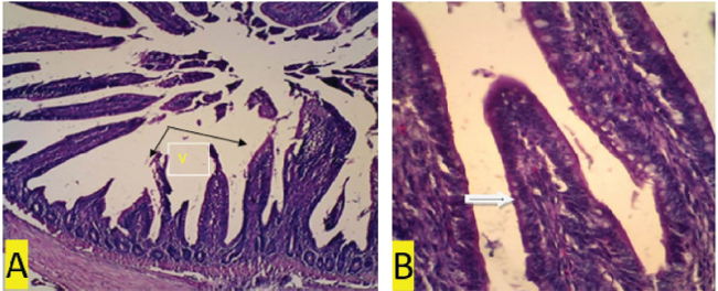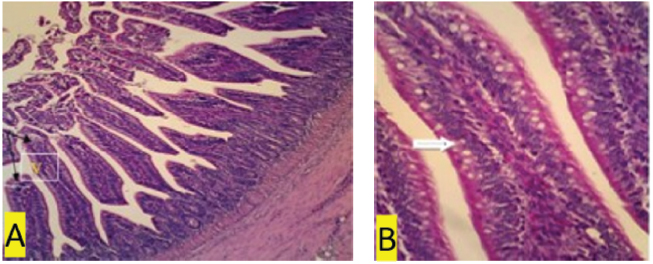 Fig. 5. (a) T3 treatment. In the ileal organ erosion epithelium appears (100x magnification). (b) T3 treatment. In the ileum organ seemed little so that the epithelial goblet cells did not function properly (400x magnification). Salmonella bacteria infect the host through contaminated food and drink. After digestion, Salmonella will react with an acidic stomach and intestinal pH. It has a tolerance toward acid. After entering the small intestine, Salmonella is exposed to the destructive effects of the luminal contents, including bile salts, enzymes, antimicrobial peptides, and IgA secretory. It has different infection pathways, i.e., through M-cells, intestinal epithelial cells, phagocytic cells, or across damaged intestinal barriers. After it penetrates the epithelial cell barrier, it is engulfed by intestinal macrophages and induces systemic disease (Khan, 2014). Inflammation of the intestines also decreases the absorption of nutrients and consequently results in weight loss (Mishra and Jha, 2019). The GIT microbiota consists mainly of bacteria and protozoa. The microbiota population varies throughout the GIT compartment, most of which are found in the distal segment. In response to commensal bacteria, the intestinal epithelium produces ROS, which functions as the second messenger and cellular signal activation. Intestinal epithelial cells function to prevent the invasion of microorganisms. Mucosal interactions with microbes or their toxins trigger oxidative stress. Oxidative stress in cells or tissues results from an imbalance between free radical production and endogenous antioxidant defenses that cause lipid peroxidation, protein nitration, DNA damage, and apoptosis. Cells will be continuously exposed to free radicals produced during physiological oxygen metabolism. ROS and RNS at certain levels show molecules involved in homeostasis. The crossing proteins between two adjacent epithelial cells and luminal intestinal epithelium cell to prevent paracellular absorption of toxins. Oxidative stress changes cellular processes and functions as an intestinal barrier (Mishra and Jha, 2019). The presence of pro-inflammatory cytokines can be used to detect specific inflammation in the tissues. Compared to the positive control, coffee extract administration reduced the MDA level of S. enteritidis-infected chickens. However, the condition of those chickens was still not comparable to that of healthy chickens (negative control) that were not infected with S. enteritidis. These results proved that the extract of local Indonesian coffee, Robusta Lampung, has an antioxidant potential against infectious agent caused by bacteria. Microorganisms have mechanisms to protect themselves against oxidative stress, using enzymes, such as catalase and superoxide dismutase, small proteins, such as thioredoxin and glutaredoxin, and molecules, such as glutathione. The genetic response of bacteria to oxidative stress is controlled by two major transcriptional regulators (OxyR and SoxRS). ROS destroys various cellular macromolecules resulting in an adaptive oxidative stress response in bacteria to maintain survival against stressors (Kashmiri and Mankar, 2014). Caffeine has bioactive components that function to reduce fatigue and increase stamina, and is an antioxidant to capture hydroxyl radicals (Liang and David, 2014). Tanin acts to bind metal ions such as Fe (II) and interfere with the Fenton reaction’s stages, thus slowing oxidation (Wafa et al., 2016). Tanin cannot increase the chicken’s growth. However, it improves the productive aspects of chicken physiology, including inhibiting meat fat oxidation, increasing protein digestibility and feed conversion, improving intestinal health and microbiota biodiversity, and higher capacity to overcome the adverse effects of persistent heat stress (Carrasco et al., 2016). The active ingredient CGA effectively reduces MDA levels through electron transfer, captures free radicals, binds metals, and activates antioxidant enzymes (Hao et al., 2015). Caffeine functions to reduce tissue inflammation through lipid peroxidation markers and pro-inflammatory cytokines in a mouse animal model with alcohol-induced liver damage (Liang and David, 2014). Phenolic compounds (such as flavonoids, phenylpropanoids, phenolic acids, and tannins) are essential components having biological activities. Polyphenols are generally of chemical patterns; the phenolic group reacts as a hydrogen donor and neutralizes free radicals (Hossain et al., 2014). The CGA consists of an ester family formed between trans-cinnamic acids, such as caffeic acid and ferulic acid, with quinic acid. Robusta coffee contains between 70 and 300 mg CGA. CGA is a polyphenol with antioxidant activity, and 5-CQA is a strong hydroxyl radical catcher (Liang and David, 2014). The results of ileum morphometry analysis are presented in Table 2. This research showed that the villus length, villus width, surface area, and depth of the crypts in the negative control are larger than the positive control. Chickens in the treatment group T1 have higher and broader villi than other treatment groups. The length of the ileum villi in the negative control group was higher than the positive control group. There were improvements in the villi length of chickens in the T1, T2, and T3 treatment groups compared to the positive control. Optimal villi length was found in T1 compared to T2 and T3. This finding suggests that the lower the coffee extract dose, the more extended the intestinal villi. Villi help increase food absorption, and the intestinal villi’s length is an indicator of intestinal function. The longer the intestinal villi, the better the mucus secretion and absorption of nutrition from the entire small intestine will be (Prakatur et al., 2019). Indeed, in this study, treatment groups T1, T2, and T3 showed weight gain compared to the positive control group. In healthy chickens, the gut bacteria can regulate the host immune defe