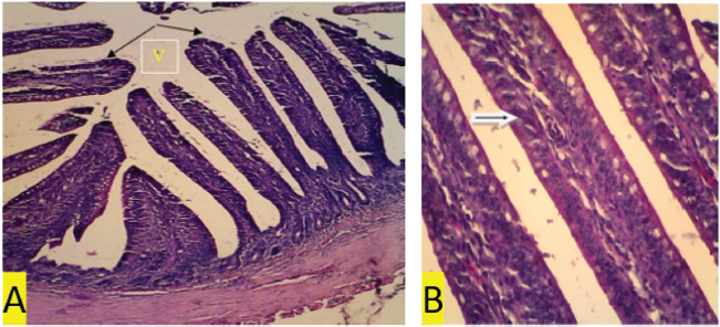 Fig. 1. (a) Negative control. In the ileal organs appear normal villi (V) (black arrow) (100x magnification). (b) Negative control. In the ileum organ appear normal goblet cells (white arrow) of epithelial regular arrangement. Histopathology observationThis study showed that compared to the negative control and treatment groups T1 and T2 (Figs. 1b, 3b and 4b), the positive control group (chickens infected with S. enteritidis bacteria) and T3 had erosions in the ileum (Figs. 2b and 5b). The negative control and treatment groups T1 and T2 showed normal epithelial arrangement with elongated villi (Figs. 1a, 3a, and 4a), and many goblet cells (Figs. 1b, 3b, and 4b). While in the T3 treatment group, we observed epithelial erosion and short vili resembling that of positive control treatment (Figs. 2a and 5a). The intestinal villi’s ability to absorb nutrients can be examined using morphometric calculations, including villi height (VH), villi width (VW), villus surface area, and the crypt depths. Villus morphometry can be observed using an Olympus microscope equipped with an X21 projector (camera) OptiLab and arranged with a magnification of 40 times. Villus heights are measured from the tip of the villi to the base, excluding crypts, and villus widths are measured halfway between the villus base and the tip, and the crypt depths are measured from the villus base upward to the region of transition between the crypt and villus (Hossain et al., 2014). According to the research conducted by Moghaddam and Alizadeh-Ghamsari (2013), the villus surface areas are calculated using the formula: 2 × 3.14 × (VW/2) × VH. DiscussionThe MDA levels (nmol/l) of the chicks in the negative control (C1) group (healthy chickens) were lower in the sick chicks [positive control (C2)]. MDA is a secondary lipid peroxidation product that acts as a marker to indicate the level of lipid oxidation. It can also act as a second messenger or react directly with biomolecules to disrupt biochemical processes (Lobo et al., 2010). MDA reacts with DNA to cause DNA damage. Lipid peroxidation refers to oxidative lipid degradation. It usually affects polyunsaturated fatty acids because they contain multiple double bonds between the methylene bridges (−CH2−), which have a reactive hydrogen. Salmonella enteritidis bacteria can produce high MDA concentrations and cause oxidative damage (Afshordi et al., 2016). Oxidative damage to membranes changes the degree of membrane fluidity, which can cause impaired membrane integrity, inactivation of membrane-bound receptors and enzymes, thus impairing normal cellular function, and increasing tissue permeability. Furthermore, lipid peroxidation’s final product can act as a “second cytotoxic messenger” to induce cell damage. Some of these products readily react with various biomolecules, including proteins, DNA, and phospholipids, to produce a stable product at the end of the reaction series thought to contribute to the disease’s pathogenesis (Aprioku, 2013).