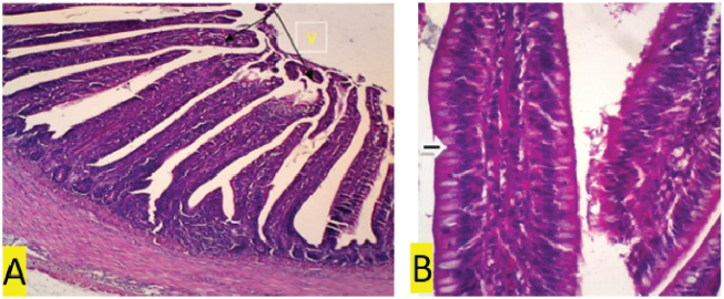 Fig. 4. (a) T2 treatment. In the ileum organ appear long villi (V) (black arrow) (100x magnification). (b) T2 treatment. In the ileum organ, epithelial cell regeneration appears, and the nucleus is many. Regular and normal epithelial arrangement and many goblet cells (white arrows) (400x magnification).