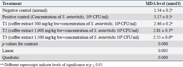 AbstractBackground: Foodborne diseases are caused by acquired pathogenic bacteria such as Salmonella enteritidis. It causes an intestinal imbalance and the microbial toxins found in the gastrointestinal tract induce symptoms such as diarrhea. Coffee contains active ingredients such as antioxidants and is used as an anti-inflammatory agent by reducing pro-inflammatory cytokine levels in the body. Aim: The purpose of this study was to determine the interaction between Lampung’s robusta coffee and tissue damage in chickens infected by S. enteritidis. Methods: This study used first-day-old Isa brown layer chickens (n=60), which were divided into five treatment groups. The negative control group consisted of healthy and normal chickens, whereas the positive control group consisted of chickens infected with S. enteritidis bacteria at a concentration of 108 CFU/ml. Groups T1, T2, and T3 were given coffee extract with doses of 500 mg/kg BW (low dose), 1,000 mg/kg BW (moderate dose), and 1,500 mg/kg BW (high dose), respectively, and then infected with S. enteritidis bacteria at a concentration of 108 CFU/ml. The coffee extract and bacteria were given orally via a feeding tube at a volume of 0.5 ml per chick. The extract was given for 14 days (from day 3 to day 16), and the bacteria were given on days 16 and 17. On day 18, the chickens were necropsied. The malondialdehyde (MDA) level was analyzed using one-way analysis of variance test with the GLM procedure (<0.05), while the tissue histopath was analyzed using a descriptive qualitative study to examine the ileal damage Results: The results showed that the MDA levels (nmol/l) decreased in treatment groups T1, T2, and T3 compared to the positive control. On the contrary, we found improvements in the ileum histopathology of group T1 and T2 in the form of normal and regular intestinal epithelium arrangement of the ileum, long intestinal villi, and decreased total leukocytes. Conclusion: Green coffee robusta has the potential to increase antioxidants and reduce inflammation in the small intestine of chickens infected with S. enteritidis. Keywords: Layer chicks, Antioxidants, Green coffee, Enteric bacteria. IntroductionConsumption of food contaminated with pathogenic microorganisms (or poison) at infective doses often causes outbreaks of foodborne diseases. Food poisoning due to pathogenic bacteria ingestion could cause intestinal balance disorders, and the microbial toxins produced could result in diarrhea (Joseph et al., 2016). Diarrhea is most frequently associated with Salmonella typhimurium and Salmonella enteritidis, which are the primary causative agents of acute gastroenteritis (Khan, 2014). The digestive tract (GIT) is an ecosystem is suitable for enteric bacterial pathogens because macro and micronutrients in the epithelial cell layer enable bacterial invasion (Omojate et al., 2014). Coffee is one of the essential food commodities in the world’s economy. The Coffea genus has more than 100 species, but Coffea arabica (arabica) and Coffea canephora (robusta) are the most used as commercial commodities (Dias and De, 2015). Coffee is a very popular drink consumed by the public and is a rich non-enzymatic source. It contains bioactive components such as caffeine, chlorogenic acid (CGA), trigonelline, cafestol, and kahweol, which at varying amounts act as a free radical activity or antioxidant activity (Liang and David, 2014). A proper physiological function requires a balance between free radicals and antioxidants. If free radicals exceed the body’s ability to regulate it, a condition known as oxidative stress occurs, especially in cell membranes containing fat called malondialdehyde (MDA) or lipid peroxidase. Free radicals will change fats, proteins, and DNA that trigger several diseases in humans and animals (Lobo et al., 2010). Endogenous and exogenous antioxidants act as “free radical scavengers” by preventing and repairing damage caused by reactive oxygen species (ROS) and reactive nitrogen species (RNS). Therefore, they can increase the immune system and reduce disease risk (Pham-Huy et al., 2008). Caffeic acid and trigonelline show inhibitory power against bacteria (Martinez-Tome et al., 2011). To date, there has been no scientific study that states the function of coffee as antioxidants in chickens. This study aims to examine Lampung’s coffee extract’s effect as an anti-inflammatory agent in layer chicks infected with S. enteritidis. Materials and MethodsAnimalsA total of 60 1-day-old layer chicks (Isa brown) were divided into five treatment groups. Each group contained 12 chicks placed in cages. Experimental designChickens were placed in closed cages, fed with commercially standard Charoen Pokphand 511-bravo, with nutritional contents containing rough protein 21%–23%, fat 5%–8%, coarse fiber 3%–5%, ash 4%–7%, and were free of antibiotics and coccidiostats. Chickens were also given commercial vitamins orally (mixed in drinks) at the age of 1, 5, and 11 days to prevent stress and help adapt to the environment. On day 4, the chicks were given live Newcastle disease (ND)-IB (Infectious bronchitis) vaccines, and on day 10, they were given ND. G7B vaccines and influenza AI H5N1 subtypes. The treatments consisted of the negative control (healthy and normal chicks), positive control (infected with S. enteritidis bacteria at a concentration of 108 CFU/ml), T1, T2, and T3 (chicks given coffee extract at a dose of 500, 1,000 and 1,500 mg/kg BW, respectively, and infected with S. enteritidis bacteria). Coffee was given daily for 14 days, from day 3 to day 16. S. enteritidis bacteria was given at a concentration of 0.5 × 108 CFU/ml for 2 days on day 16 and day 17. Coffee extract and bacteria were given orally with a volume of 0.5 ml. On the 18th day, the chicks were slaughtered, blood samples were collected, and necropsy on the small intestine was performed. Preparation of coffee extractLampung’s Robusta coffee seed powder wa