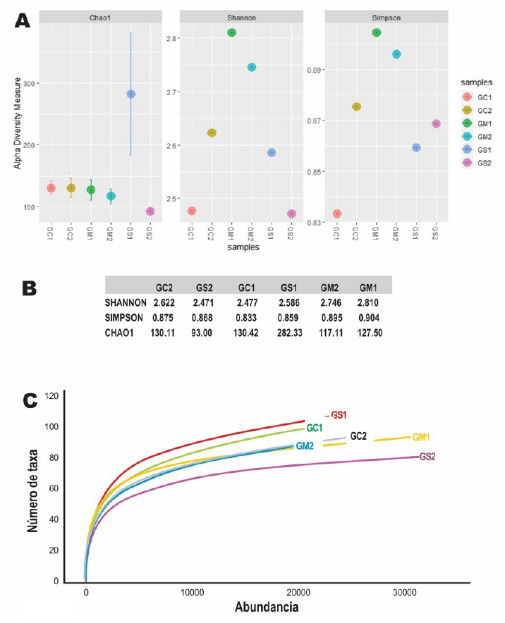 Fig. 1. Diversity indices between diets. A) Shannon, Simpson, and Chao1 diversity indices between samples using the Phyloseq package from R. B) Table of diversity indices between samples. C) Rarefaction curve showing bacterial diversity versus abundance number showing that the GS1 sample related to young goats using the vegan package using R.
