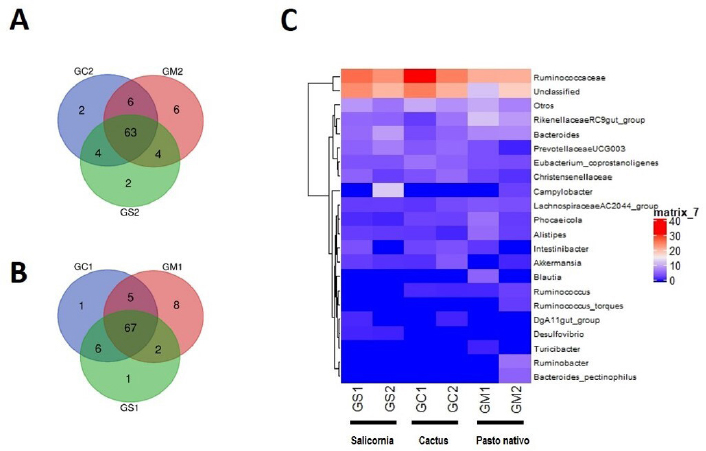 Fig. 3. Diagram illustrating the number of taxa in the superposition of the core bacterial communities. A) Goats fed with cactus, Salicornia, and native grass. B) Kids fed with cactus, Salicornia, and native grass. C) Heat map showing the gradients of higher and lower heat of bacteria between different diets. The previously identified core microbiome genera identified in both samples belonged to the order Alphaproteobacteria and Gammaproteobacteria. Then, we proceeded to characterize the unique microbiome of the first group of goats fed with cactus and native grass where GC1, GC2, GM1, and GM2 were 1, 1, 0, and 10 OTUs, respectively. The second group of goats fed with Salicornia and native grass was GM1, GM2, GS1, and GS2 with 1, 1, 0, and 0 OTUs, respectively. Afterward, the third group of goats fed with cactus and Salicornia was GC1, GC2, GS1, and GS2 with 0, 1, 2, and 0 OTUs, respectively (Fig. 3). The fourth group of goats fed with cactus and Salicornia was GC1, GM1, and GS1 were 1, 8, and 1 OTUs, respectively. Finally, the fifth group of goats fed with cactus and Salicornia was GC2, GM2, and GS2 was 2, 6, and 2 OTUs, respectively. It is worth mentioning that the bacterial genera identified in the nucleus microbiome of the first, second, third, and fourth group presented bacterial diversity, contrary to the fifth group where bacterial diversity was broadly demonstrated during the taxonomic analysis. DiscussionThe purpose of our research was to identify, characterize, and evaluate the microbiome of creole goats fed with different diets (cactus and Salicornia) compared to native grass. To do this, we resorted to the latest generation next-generation sequencing (NGS), a massive sequencing technique, which allowed us to characterize the bacterial microbiome at different taxonomic levels from phylum to genus. In the results, we find that Bacteroidetes and Firmicutes at the phylum level are the two most abundant OTUs in the microbiome of creole goats, ranging from 18% to 36% and from 47% to 66% respectively, influenced by the different diets between the samples and corroborated by previous research based on NGS technologies (Chaucheyras-Durand et al., 2016; Deusch et al., 2017; Cui et al., 2019). The intestinal tract of most ruminants is dominated by these types of phyla (Wang et al., 2019), and they play essential roles in carbohydrate, protein, and fiber metabolism (Huo et al., 2014). The percentage of Bacteroidetes, related to organic decomposition, decreases with increasing age, otherwise with Firmicutes, which are related to high fiber decomposition. Thus, we identified that those creole goats fed with cacti presented a greater abundance of Firmicutes concerning the other groups investigated as they contain a higher concentration of plant fibers. In this way, the host microbiome changes under the influence of high fiber diets, as many previous studies have been carried out in herbivores (Hook et al., 2011). The genus-level shows a significant change in the taxa altered by changing diets. Our results highlight variants of the genus Ruminococcaceae, related to cellulose degradation, as the most dominant in all samples, followed by Christensenellaceae, Rikenellaceae, and Prevotellaceae. But Campylobacter remarkably predominates in adult goats fed Salicornia. However, our results differ from previous research showing Prevotella as the most abundant genus (Pitta et al., 2010; Deusch et al., 2017; Wang et al., 2019; Ciu et al., 2019). On the other hand, Belzer and De Vos (2012) and Lagier et al. (2015) mention that Akkermansia is widely distributed in the intestinal tract of humans and animals and related to mucosal health (Derrien et al., 2016) and energy metabolism and inflammation markers (Schneeberger et al., 2015; Guo et al., 2017). Furthermore, studies report increased levels of pro-inflammatory TNF-α and IFN-γ are associated with higher amounts of Akkermansia sp. in breast milk (Collado et al., 2012). In our research, Akkermansia was identified with a higher presence in kids fed Salicornia. It is necessary to understand that the study of the bacterial microbiome allows us to know the diversity and richness of species related to the organism’s activity and behavior in the face of environmental conditions; in addition, a minimal change in the lifestyle of organisms could drastically change the bacterial microbiome. In conclusion, despite the reduced number of samples in the present study, we were able to identify that Firmicutes and Bacteroides play essential roles in the fiber-based feeding of creole goats, where a high population of both phyla would improve the production characteristics in creole goats such as weight gain, a proliferation of offspring, increase in milk, and meat production. AcknowledgmentsThis work was financed by contract No. 030-2016 from the National Institute of Agrarian Innovation (INIA), National Program of Agrarian Innovation (PNIA), UPMSI/IE, World Bank, and Inter-American Development Bank. The authors thank Rosita Morocho, Ivan Alama, Raúl Aponte, and Reyner Seminario for their support in the handling and feeding of the goats. Conflict of interestThe authors declare that there is no conflict of interest. ReferencesAllali, I., Arnold, J.W., Roach, J., Cadenas, M.B., Butz, N., Hassan, H.M. and Azcarate-Peril, M.A. 2017. A comparison of sequencing platforms and bioinformatics pipelines for compositional analysis of the gut microbiome. BMC Microbiol. 17(1), 194. Arroyo, B.O. 1998. Producción de caprinos. Ed., Procabra. Lima, Perú, pp: 33. Benson, A.K., Kelly, S.A., Legge, R., Ma, F., Low, S.J., Kim. J. and Kachman, S.D. 2010. Individuality in gut microbiota composition is a complex polygenic trait shaped by multiple environmental and host genetic factors. Proc. Natl. Acad. Sci. U.S.A. 107(44), 18933–18938. Belzer, C. and De Vos, W.M. 2012. Microbes inside from diversity to function: the case of Akkermansia. ISME J. 6, 1449–1458. Bokulich, N.A., Subra