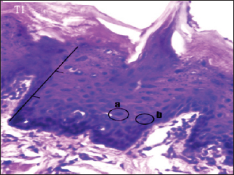 Fig. 5. Histopathological appearance of the rat tongue epithelium in group T3, microscope at ×400. (a) irregular polygonal cell shape in the spinosum layer; (b) oval cell shape in the granulosum layer.