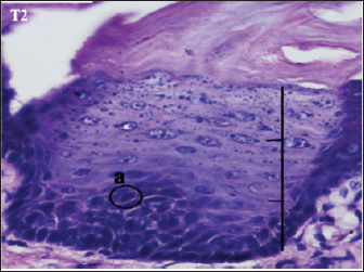 Fig. 4. Histopathological description of the rat tongue epithelium in the T2 group, microscope at ×400. (a) Variations in cell shape with hyperchromatic nuclei. Multiple illnesses and symptoms in OSCC are due to genetic mutations. The early stage is undetectable and painless, then pain with a burning sensation develops, and finally, neoplasia. (Yakob et al., 2014). According to Dost et al. (2014), OSCC is typically preceded by OED, which consists of tissue and cellular alterations consistent with carcinoma but limited to the surface epithelium (OED).
