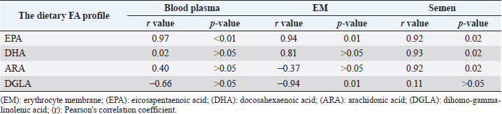 Table 2. Correlation between the FA profile of the standard commercial dog food (diet) and the corresponding concentrations in blood plasma, EM, and semen in the study population (n=12 dogs).