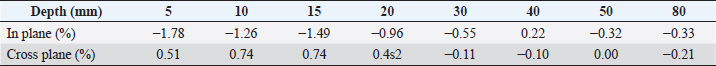 Fig. 1. Measured dose profiles along the two axes using film (a: in plane i.e., along the X-ray tube; b: cross plane). This figure was referred the Figure 3 of reference Iseri et al., 2023. Figure 2 shows the Monte Carlo simulation percentage depth dose and the measured percentage depth dose. The dose difference between the measured dose and beam modeling was adjusted to within at least 2.0% along the central axis. Figure 3 shows the radiation dose distributions estimated by Monte Carlo simulations for linear accelerator radiotherapy under near-irradiation conditions and for orthovoltage radiation. The absorbed dose to the skull near the surface with orthovoltage radiation was similar to that of the single port irradiation, and the reduction rate of orthovoltage radiation was high. The percentage depth dose in bone with orthovoltage radiotherapy was more than 40%. With orthovoltage radiotherapy, a build-up of more than 40% was seen in the bone region, with build-down after bone transmission (Fig. 4a). With linear accelerator radiotherapy, there was little change in absorption in the bone region, although a slight rebound was seen after bone transmission (Fig. 4b). Figure 5 shows the water phantom that was created using a 3D printer. The dog skull water phantom was water impermeable, had inserts for Farmer dosimetry chambers and two sheets of Gafchromic film, and could be used to perform animal-specific radiotherapy QA. DiscussionIn small animals, radiotherapy is often performed in shallow areas. The use of Monte Carlo simulations to aid dosimetry is helpful for evaluating dose distribution, but in veterinary medicine education, visual simulation phantoms can be quicker to use and learn from. In this study, the use of simulated doses and measurements in a water phantom provided us with an understanding that could be applied to create a 3D printed animal-specific dog skull water phantom with appropriate inserts for dosimetry chambers and Gafchromic sheets that was water impermeable and had high gas impermeability and permitted pre-treatment radiotherapy QA. As shown by the results of the off-axis ratios, the heel effect is seen at a shallow depth of about 1.5 cm, a finding that is reflected in past research (Knöös et al., 2007; Azim et al., 2015). The radiation field size was asymmetric, which may change over time because this study’s orthovoltage machine was made more than 20 years after its introduction. Additionally, since vendors fine-tune the beam quality and target angle at each facility, we believe that beam modeling per facility, as for linear accelerator equipment, is essential. Table 2. The ratio of dose difference for10 mm off axis at each side.