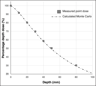 Fig. 2. Depth dose curves for orthovoltage radiotherapy. The graph compares a Monte Carlo simulation and water measurements. This figure was referred the Figure 2 of reference Iseri et al., 2023.
