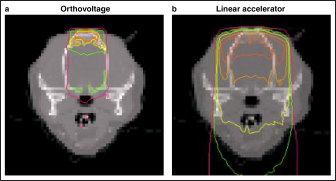 Fig. 3. Dose distribution using Monte Carlo simulations (a: orthovoltage radiotherapy; b: linear accelerator radiotherapy). Based on the comparison of orthovoltage and linear accelerator radiotherapy, the absorbed dose was similar to that of the linear accelerator in the bone near the surface. Still, the orthovoltage radiation had more excellent attenuation as bone depth increased. The interaction between photons and matter is greatly affected by the energy range. The photoelectric effect region for orthovoltage radiation is affected by atomic number, in contrast to the Compton scattering region, which affects linear accelerator radiation (Jones et al., 2018). We believe that visualizing the dose distribution accuracy of orthovoltage radiotherapy for veterinary medicine is helpful in evaluating targets and at-risk organs. Furthermore, the dose distribution serves as a criterion for selecting either orthovoltage or linear accelerator radiotherapy. In addition, the dose measurement for the surface as a crystalline lens generally uses a Gafchromic film and solid water phantom. However, this study method could be measured in near clinical conditions by placing a Gafchromic film on the eyes of the dog phantom, and the dose of the crystalline lens could be evaluated using Monte Carlo simulations.
