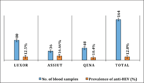 Fig. 1. Prevalence of serum anti-HEV among rabbits in different regions in Egypt. Table 3. Prevalence of HEV RNA in fecal samples among rabbits at different regions in Egypt.