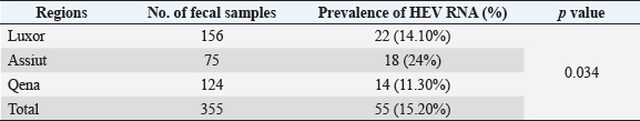 Fig. 2. Prevalence of HEV RNA in fecal samples among rabbits at different regions in Egypt. Table 4. Age-related frequency of HEV infection at different Egypt governorates among rabbits population.