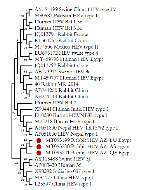 Nucleotide sequence analysis of HEVTotal installed nucleotide sequence of three isolates of rabbit HEV, one isolates from every governorate. After the exclusion of identical sequences in the GenBank database sequences were deposited three fragment ORF2 HEV rabbits, by accession number MT093199–MT093201. For phylogenetic analysis revealed fragments of HEV genome in GenBank database and we have selected the reference sequence of the rabbit HEV isolated from China, Russia, and France, and differ from each other by more than 1%, as well as a large number of sequences from the human HEV and pigs of various genotypes and subtypes circulating in different country of the world. The results of phylogenetic analysis recorded that HEV isolated from rabbits in this study form a single cluster with all known to date HEV sequences from rabbits in other city, forming phylogroups rabbit HEV close genotype 3 HEV. Sequences HEV from rabbits in different governorates in Egypt in this study (indicated in Fig. 3 as the Rabbit HEV AZ) is formed on tree a single phylogenetic group, with the degree of similarity within the group of 84%–99%. Isolated from the Luxor and Assiut region form one group [MT093199 Rabbit HEV AZ-LU Egypt and MT093200 Rabbit HEV AZ-AS Egypt, respectively, (Fig. 3)], the second group—included isolates from Qena region [MT093201 Rabbit HEV AZ-QE Egypt, (Fig. 3)]. The degree of similarity between the sequences of two groups of isolates—84%, the degree of similarity within groups 99%. All three groups of rabbit HEV identified in our work sequencing grouped with Chinese HEV isolates, with them as the group includes only published rabbit HEV isolate from the US. Frence rabbit HEV isolates form a separate group in the tree, the differences between them and identified in our work sequences formed 27%. It should be shown that all the rabbits' HEV sequences, identified in our work, and released earlier, form a separate group, and are different from the genotype 3 HEV sequences isolated from humans and pigs in Egypt and other countries in the 21%–27%.
